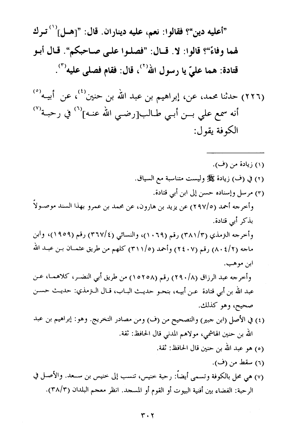 ٢٢٦ - حَدَّثَنَا مُحَمَّدٌ، عَنْ إِبْرَاهِيمَ بْنِ عَبْدِ اللَّهِ بْنِ حُنَيْنٍ، عَنْ أَبِيهِ أَنَّهُ سَمِعَ عَلِيَّ بْنَ أَبِي طَالِبٍ رَضِيَ اللَّهُ عَنْهُ فِي رَحَبَةِ الْكُوفَةِ يَقُولُ: ⦗٣٠٣⦘ " نَهَانِي رَسُولُ اللَّهِ صَلَّى اللهُ عَلَيْهِ وَسَلَّمَ، وَلَا أَقُولُ: نَهَاكُمْ عَنْ لُبْسِ الْقَسِّيِّ، وَالْمُعَصْفَرِ، وَعَنْ تَخَتُّمِ الذَّهَبِ، وَعَنْ قِرَاءَةِ الْقُرْآنِ وَأَنَا رَاكِعٌ "