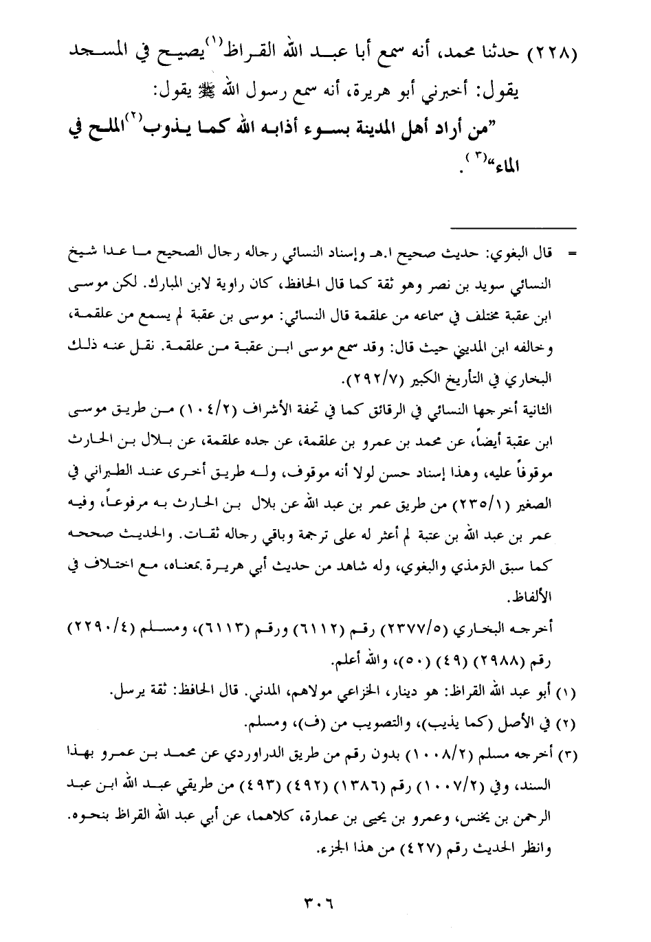 ٢٢٨ - حَدَّثَنَا مُحَمَّدٌ، أَنَّهُ سَمِعَ أَبَا عَبْدِ اللَّهِ الْقَرَّاظَ، يَصِيحُ فِي الْمَسْجِدِ يَقُولُ: أَخْبَرَنِي أَبُو هُرَيْرَةَ أَنَّهُ سَمِعَ رَسُولَ اللَّهِ صَلَّى اللهُ عَلَيْهِ وَسَلَّمَ يَقُولُ: «مَنْ أَرَادَ أَهْلَ الْمَدِينَةِ بِسُوءٍ أَذَابَهُ اللَّهُ كَمَا يَذُوبُ الْمِلْحُ فِي الْمَاءِ»