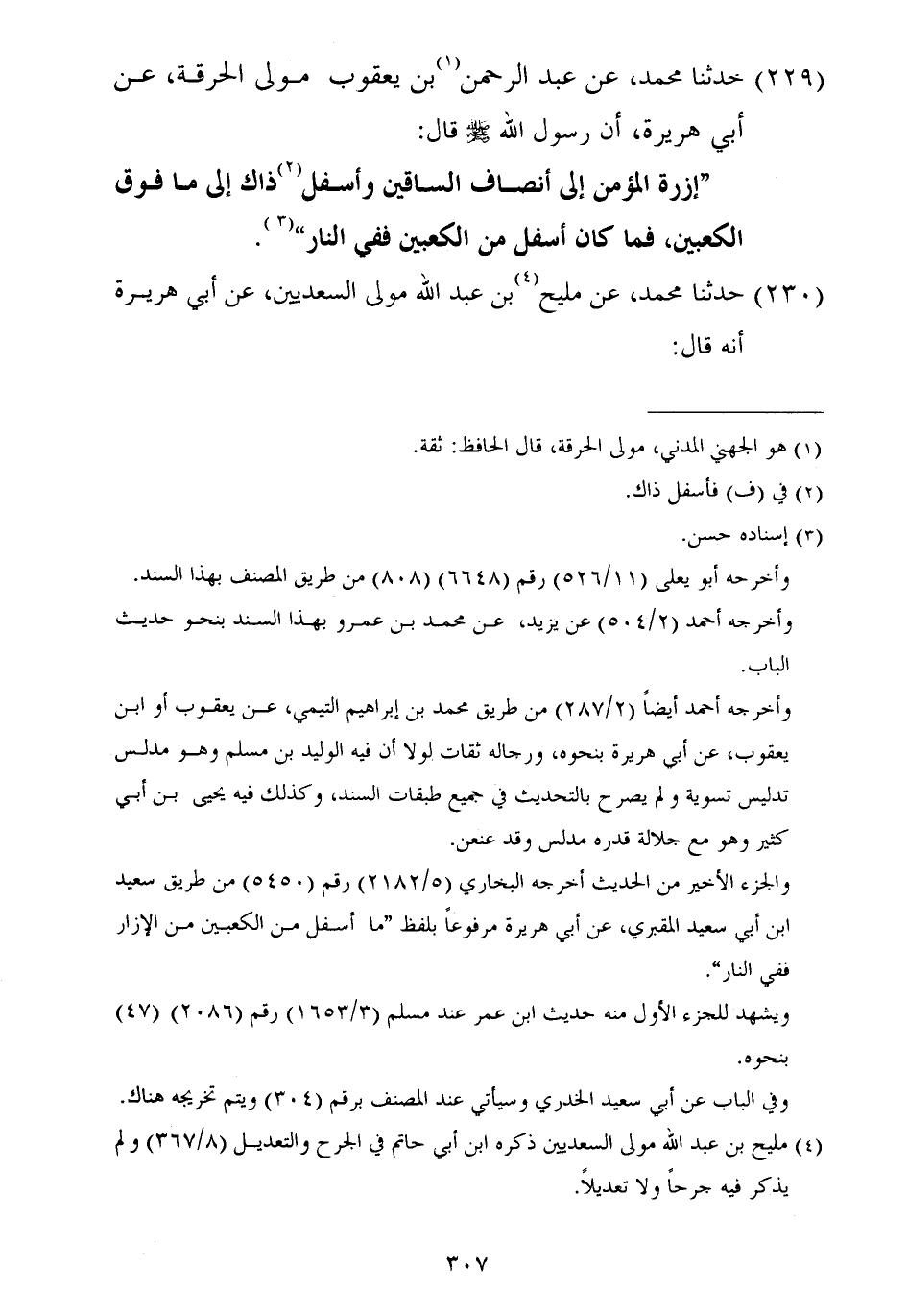 ٢٢٩ - حَدَّثَنَا مُحَمَّدٌ، عَنْ عَبْدِ الرَّحْمَنِ بْنِ يَعْقُوبَ، مَوْلَى الْحُرَقَةِ، عَنْ أَبِي هُرَيْرَةَ أَنَّ رَسُولَ اللَّهِ صَلَّى اللهُ عَلَيْهِ وَسَلَّمَ قَالَ: «إِزْرَةُ الْمُؤْمِنِ إِلَى أَنْصَافِ السَّاقَيْنِ، وَأَسْفَلَ ذَاكَ إِلَى مَا فَوْقَ الْكَعْبَيْنِ، فَمَا كَانَ أَسْفَلَ مِنَ الْكَعْبَيْنِ فَفِي النَّارِ»