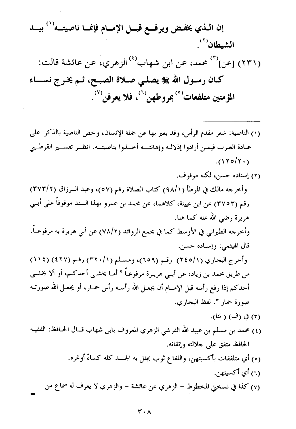 ٢٣١ - عَنْ مُحَمَّدٍ، عَنِ ابْنِ شِهَابٍ الزُّهْرِيِّ، عَنْ عَائِشَةَ، قَالَتْ: كَانَ رَسُولُ اللَّهِ صَلَّى اللهُ عَلَيْهِ وَسَلَّمَ يُصَلِّي صَلَاةَ الصُّبْحِ، ثُمَّ يَخْرُجُ نِسَاءُ الْمُؤْمِنِينَ مُتَلَفِّعَاتٍ بِمُرُوطِهِنَّ، فَلَا يُعْرَفْنَ "