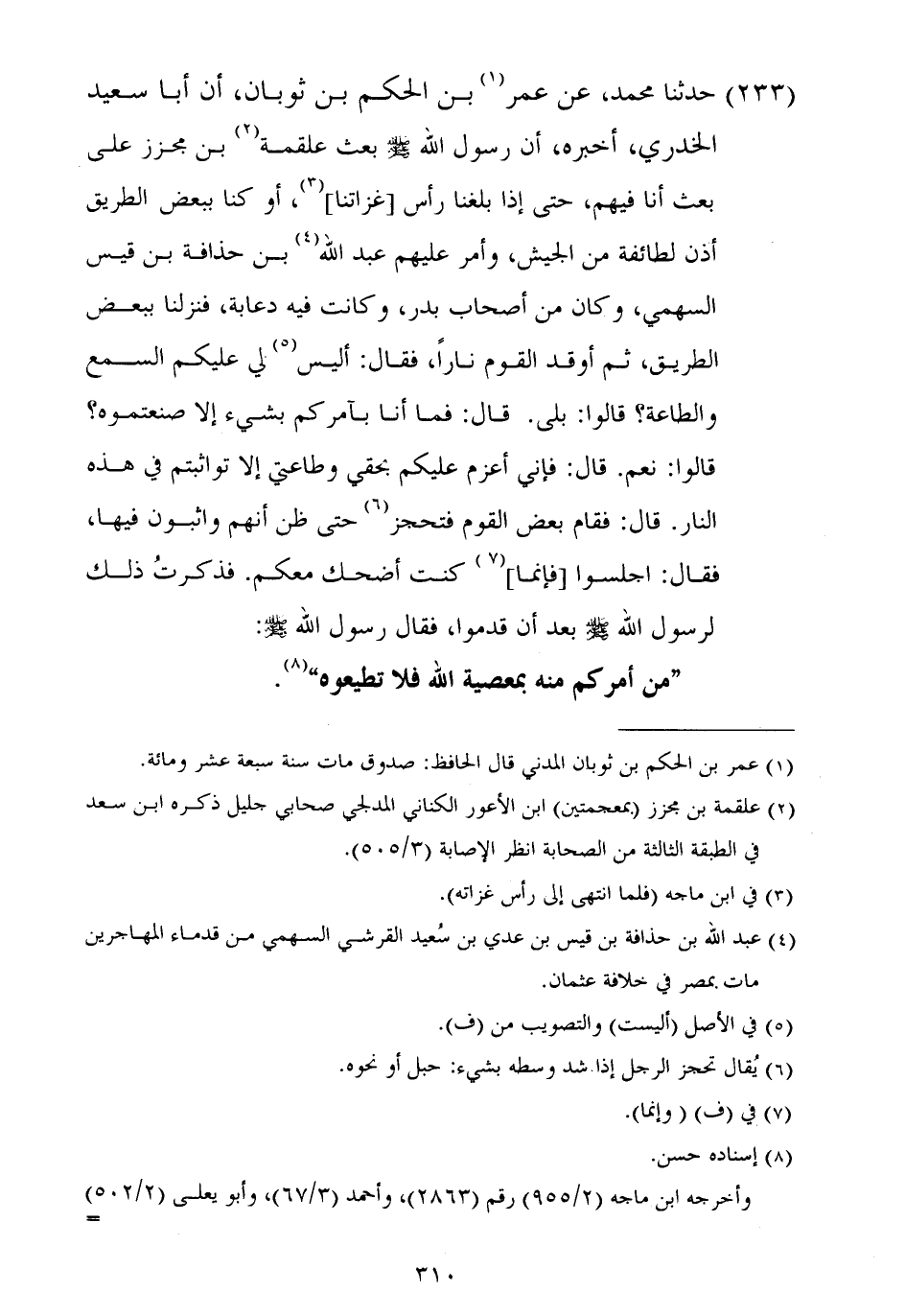 ٢٣٣ - حَدَّثَنَا مُحَمَّدٌ، عَنْ عُمَرَ بْنِ الْحَكَمِ بْنِ ثَوْبَانَ، أَنَّ أَبَا سَعِيدٍ الْخُدْرِيَّ، أَخْبَرَهُ أَنَّ رَسُولَ اللَّهِ صَلَّى اللهُ عَلَيْهِ وَسَلَّمَ بَعَثَ عَلْقَمَةَ بْنَ مُجَزِّزٍ عَلَى بَعْثٍ أَنَا فِيهِمْ، حَتَّى إِذَا بَلَغْنَا رَأْسَ غَزَاتِنَا، أَوْ كُنَّا بِبَعْضِ الطَّرِيقِ أَذِنَ لِطَائِفَةٍ مِنَ الْجَيْشِ، وَأَمَّرَ عَلَيْهِمْ عَبْدَ اللَّهِ بْنَ حُذَافَةَ بْنِ قَيْسٍ السَّهْمِيَّ، وَكَانَ مِنْ أَصْحَابِ بَدْرٍ، وَكَانَتْ فِيهِ دُعَابَةٌ، فَنَزَلْنَا بِبَعْضِ الطَّرِيقِ، ثُمَّ أَوَقَدَ الْقَوْمُ نَارًا، فَقَالَ: أَلَيْسَ لِي عَلَيْكُمُ السَّمْعُ وَالطَّاعَةُ؟ قَالُوا: بَلَى قَالَ: فَمَا أَنَا بِآمِرِكُمْ بِشَيْءٍ إِلَّا صَنَعْتُمُوهُ؟ قَالُوا: نَعَمْ قَالَ: فَإِنِّي أُعَزِّمُ عَلَيْكُمْ بِحَقِّي وَطَاعَتِي إِلَّا تَوَاثَبْتُمْ فِي هَذِهِ النَّارِ، قَالَ: فَقَامَ بَعْضُ الْقَوْمِ فَتَحَجَّزَ حَتَّى ظَنَّ أَنَّهُمْ وَاثِبُونَ فِيهَا، فَقَالَ: اجْلِسُوا فَإِنَّمَا كُنْتُ أَضْحَكُ مَعَكُمْ، فَذَكَرْتُ ذَلِكَ لِرَسُولِ اللَّهِ صَلَّى اللهُ عَلَيْهِ وَسَلَّمَ بَعْدَ أَنْ قَدِمُوا، فَقَالَ رَسُولُ اللَّهِ صَلَّى اللهُ عَلَيْهِ وَسَلَّمَ: «مَنْ أَمَرَكُمْ مِنْهُ بِمَعْصِيَةِ اللَّهِ فَلَا تُطِيعُوهُ»