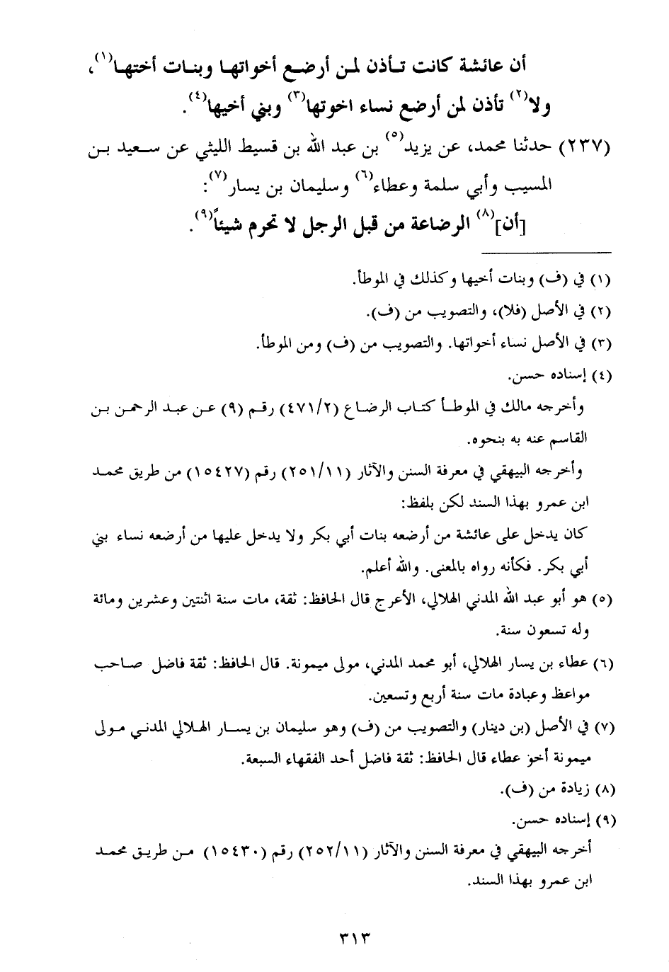 ٢٣٧ - حَدَّثَنَا مُحَمَّدٌ، عَنْ يَزِيدَ بْنِ عَبْدِ اللَّهِ بْنِ قُسَيْطٍ اللَّيْثِيِّ، عَنْ سَعِيدِ بْنِ الْمُسَيِّبِ، وَأَبِي سَلَمَةَ وَعَطَاءٍ وَسُلَيْمَانَ بْنِ يَسَارٍ: «أَنَّ الرَّضَاعَةَ، مِنْ قِبَلِ الرَّجُلِ لَا تُحَرِّمُ شَيْئًا»