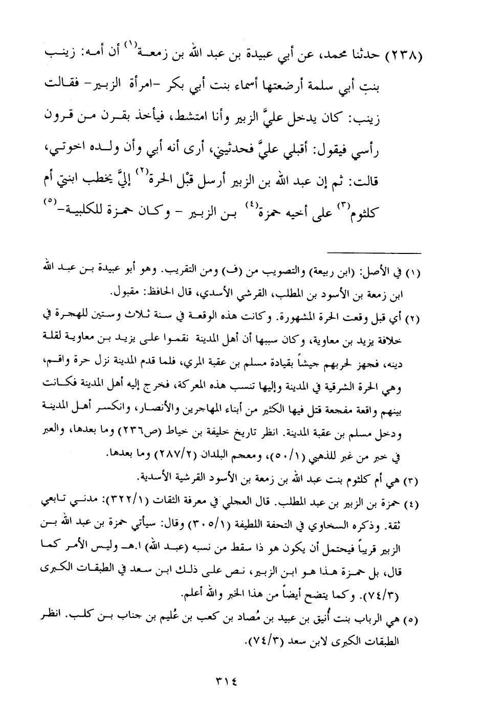 ٢٣٨ - حَدَّثَنَا مُحَمَّدٌ، عَنْ أَبِي عُبَيْدَةَ بْنِ عَبْدِ اللَّهِ بْنِ زَمْعَةَ أَنَّ أُمَّهُ زَيْنَبَ بِنْتَ أَبِي سَلَمَةَ أَرْضَعَتْهَا أَسْمَاءُ بِنْتُ أَبِي بَكْرٍ امْرَأَةُ الزُّبَيْرِ فَقَالَتْ زَيْنَبُ: كَانَ يَدْخُلُ عَلَيَّ الزُّبَيْرُ وَأَنَا أَمْتَشِطُ، فَيَأْخُذُ بِقَرْنٍ مِنْ قُرُونِ رَأْسِي فَيَقُولُ: أَقْبِلِي عَلَيَّ فَحَدِّثِينِي، أَرَى أَنَّهُ أَبِي وَأَنْ وَلَدَهُ إِخْوَتِي، قَالَتْ: ثُمَّ إِنَّ عَبْدَ اللَّهِ بْنَ الزُّبَيْرِ أَرْسَلَ قَبْلَ الْحَرَّةِ إِلَيَّ يَخْطُبُ ابْنَتِي أُمَّ كُلْثُومٍ عَلَى أَخِيهِ حَمْزَةَ بْنِ الزُّبَيْرِ، وَكَانَ حَمْزَةُ لِلْكَلْبِيَّةِ ⦗٣١٥⦘ فَقُلْتُ لِرَسُولِهِ: وَهَلْ تَحِلُّ لَهُ وَإِنَّمَا هِيَ بِنْتُ أُخْتِهِ؟، فَأَرْسَلَ عَبْدُ اللَّهِ إِلَيَّ: إِنَّمَا تُرِيدِينَ الْمَنْعَ لِمَا قِبَلَكِ، لَيْسَ لَكِ بِأَخٍ، إِنَّكِ وَمَا وَلَدَتْ أَسْمَاءُ إِخْوَتُكِ، وَمَا كَانَ مِنْ وَلَدِ الزُّبَيْرِ مِنْ غَيْرِ أَسْمَاءَ فَلَيْسُوا لَكِ بِإِخْوَةٍ، فَأَرْسِلِي فَسَلِي عَنْ هَذَا، فَأَرْسَلَتْ، فَسَأَلَتْ وَأَصْحَابُ رَسُولِ اللَّهِ صَلَّى اللهُ عَلَيْهِ وَسَلَّمَ مُتَوَافِرُونَ، وَأُمَّهَاتُ الْمُؤْمِنِينَ، فَقَالُوا لَهَا: «إِنَّ الرَّضَاعَةَ مِنْ قِبَلِ الرَّجُلِ لَا تُحَرِّمُ شَيْئًا، فَأَنْكَحَتْهَا إِيَّاهُ، فَلَمْ تَزَلْ عِنْدَهُ حَتَّى هَلَكَتْ»