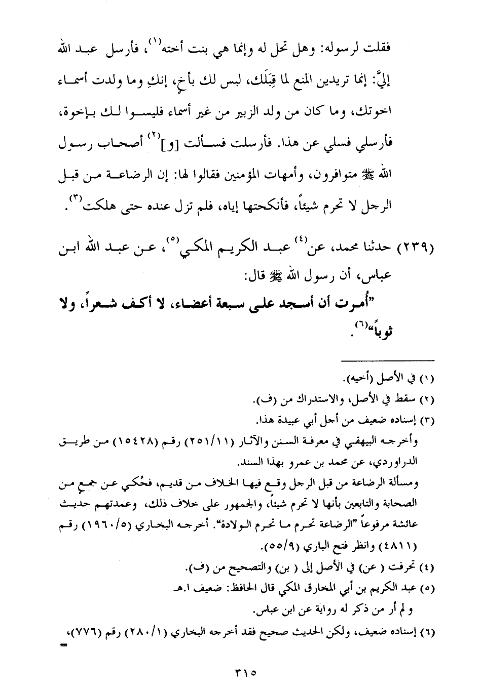 ٢٣٩ - حَدَّثَنَا مُحَمَّدٌ،: عَنْ عَبْدِ الْكَرِيمِ الْمَكِّيِّ، عَنْ عَبْدِ اللَّهِ بْنِ عَبَّاسٍ أَنَّ رَسُولَ اللَّهِ صَلَّى اللهُ عَلَيْهِ وَسَلَّمَ قَالَ: «أُمِرْتُ أَنْ أَسْجُدَ عَلَى سَبْعَةِ أَعْضَاءٍ، لَا أَكُفُّ شَعْرًا، وَلَا ثَوْبًا»