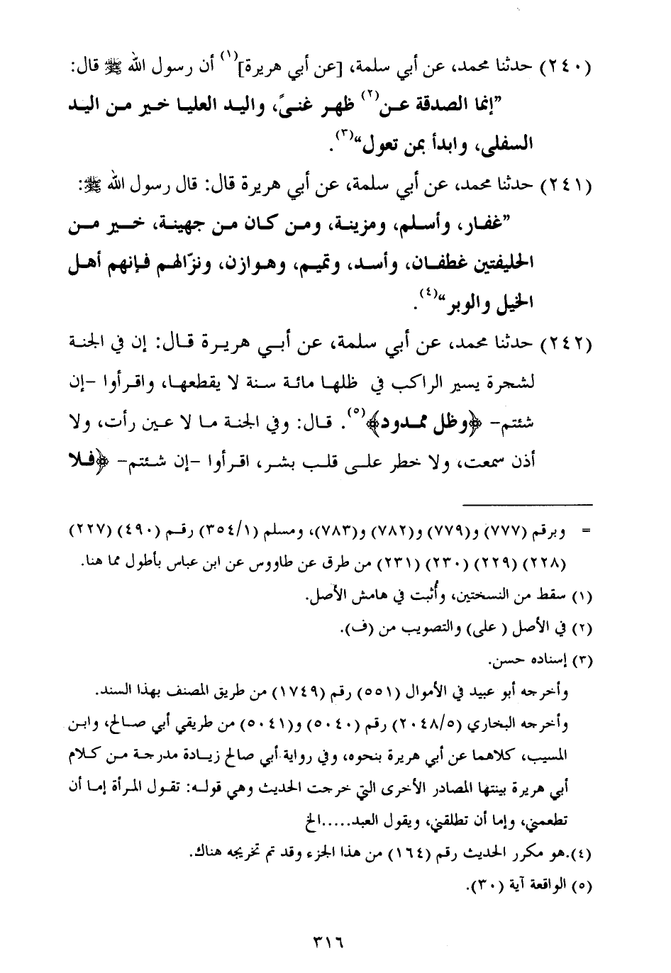 ٢٤٠ - حَدَّثَنَا مُحَمَّدٌ، عَنْ أَبِي سَلَمَةَ، عَنْ أَبِي هُرَيْرَةَ أَنَّ رَسُولَ اللَّهِ صَلَّى اللهُ عَلَيْهِ وَسَلَّمَ قَالَ: «إِنَّمَا الصَّدَقَةُ عَنْ ظَهْرِ غِنًى، وَالْيَدُ الْعُلْيَا خَيْرٌ مِنَ الْيَدِ السُّفْلَى، وَابْدَأْ بِمَنْ تَعُولُ»