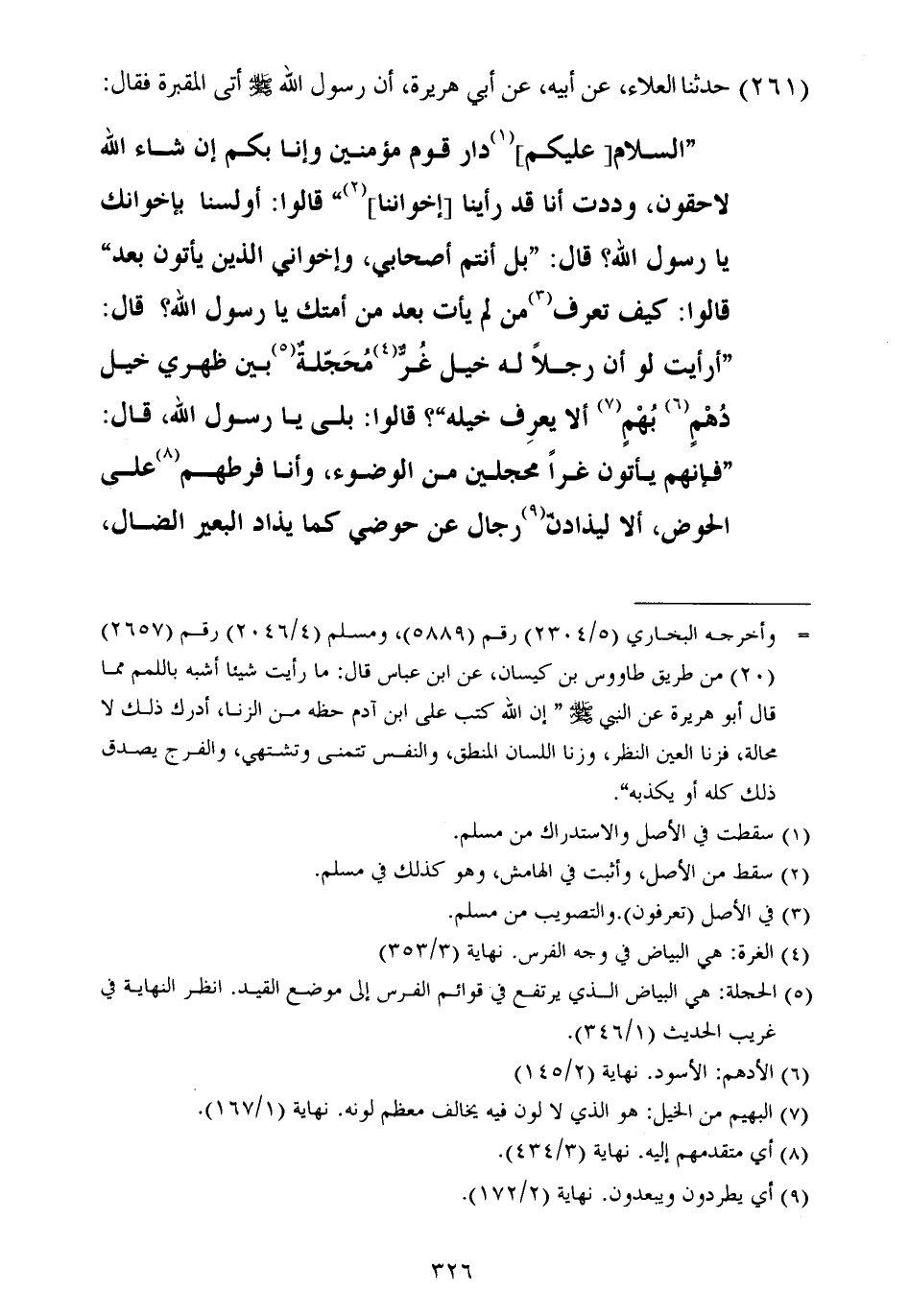 ٢٦١ - حَدَّثَنَا الْعَلَاءُ، عَنْ أَبِيهِ، عَنْ أَبِي هُرَيْرَةَ أَنَّ رَسُولَ اللَّهِ صَلَّى اللهُ عَلَيْهِ وَسَلَّمَ أَتَى الْمَقْبَرَةَ فَقَالَ: «السَّلَامُ عَلَيْكُمْ دَارَ قَوْمٍ مُؤْمِنِينَ وَإِنَّا بِكُمْ إِنْ شَاءَ اللَّهُ لَاحِقُونَ، وَدِدْتُ أَنَّا قَدْ رَأَيْنَا إِخْوَانَنَا» قَالُوا: أَوَلَسْنَا بِإِخْوَانِكَ يَا رَسُولَ اللَّهِ؟ قَالَ: «بَلْ أَنْتُمْ أَصْحَابِي، إِخْوَانِي الَّذِينَ يَأْتُونَ بَعْدُ» قَالُوا: كَيْفَ تَعْرِفُ مَنْ لَمْ يَأْتِ بَعْدَ أُمَّتِكَ يَا رَسُولَ اللَّهِ؟ قَالَ: «أَرَأَيْتَ لَوْ أَنَّ رَجُلًا لَهُ خَيْلٌ غُرٌّ مُحَجَّلَةٌ بَيْنَ ظَهْرَيْ خَيْلٍ دُهْمٍ بُهْمٍ أَلَا يَعْرِفُ خَيْلَهُ» ؟ قَالُوا: بَلَى يَا رَسُولَ اللَّهِ، قَالَ: " فَإِنَّهُمُ يَأْتُونَ غُرًّا مُحَجَّلِينَ مِنَ الْوُضُوءِ، وَأَنَا فَرَطُهُمْ عَلَى الْحَوْضِ، أَلَا لَيُذَادَنَّ رِجَالٌ عَنْ حَوْضِي كَمَا يُذَادُ الْبَعِيرُ الضَّالُّ، ⦗٣٢٧⦘ أُنَادِيهِمْ: أَلَا هَلُمَّ، فَيُقَالُ: إِنَّهُمْ قَدْ بَدَّلُوا بَعْدَكَ فَأَقُولُ: فَسُحْقًا فَسُحْقًا "
