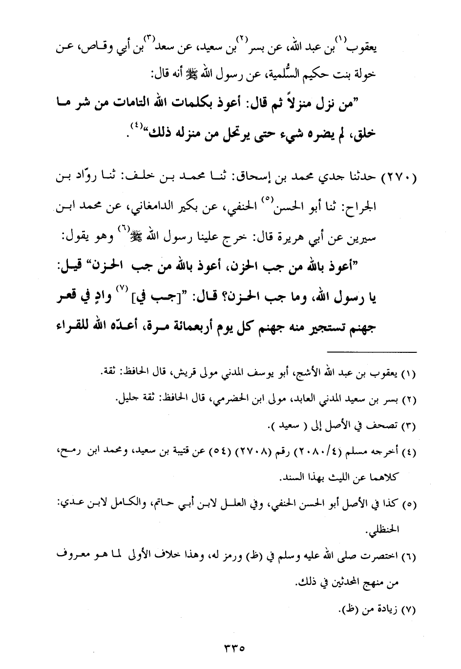 ٢٧٠ - حَدَّثَنَا جَدِّي مُحَمَّدُ بْنُ إِسْحَاقَ: ثنا مُحَمَّدُ بْنُ خَلَفٍ: ثنا رَوَّادُ بْنُ الْجَرَّاحِ، ثنا أَبُو الْحَسَنِ الْحَنَفِيُّ، عَنْ بُكَيْرٍ الدَّامِغَانِيِّ، عَنْ مُحَمَّدِ بْنِ سِيرِينَ، عَنْ أَبِي هُرَيْرَةَ، قَالَ: خَرَجَ عَلَيْنَا رَسُولُ اللَّهِ صَلَّى اللهُ عَلَيْهِ وَسَلَّمَ، وَهُوَ يَقُولُ: «أَعُوذُ بِاللَّهِ مِنْ جُبِّ الْحُزْنِ، أَعُوذُ بِاللَّهِ مِنْ جُبِّ الْحُزْنِ» قِيلَ: يَا رَسُولَ اللَّهِ، وَمَا جُبِّ الْحُزْنِ؟ قَالَ: «جُبٌّ فِي وَادٍ فِي قَعْرِ جَهَنَّمَ تَسْتَجِيرُ مِنْهُ جَهَنَّمُ كُلَّ يَوْمٍ أَرْبَعْمِائَةِ مَرَّةٍ، أَعَدَّهُ اللَّهُ لِلْقُرَّاءِ ⦗٣٣٦⦘ الْمُرَائِينَ بِأَعْمَالِهِمْ، وَإِنَّ أَبْغَضَ الْخَلْقِ إِلَى اللَّهِ قَارِئٌ يَزُورُ الْعُمَّالَ»