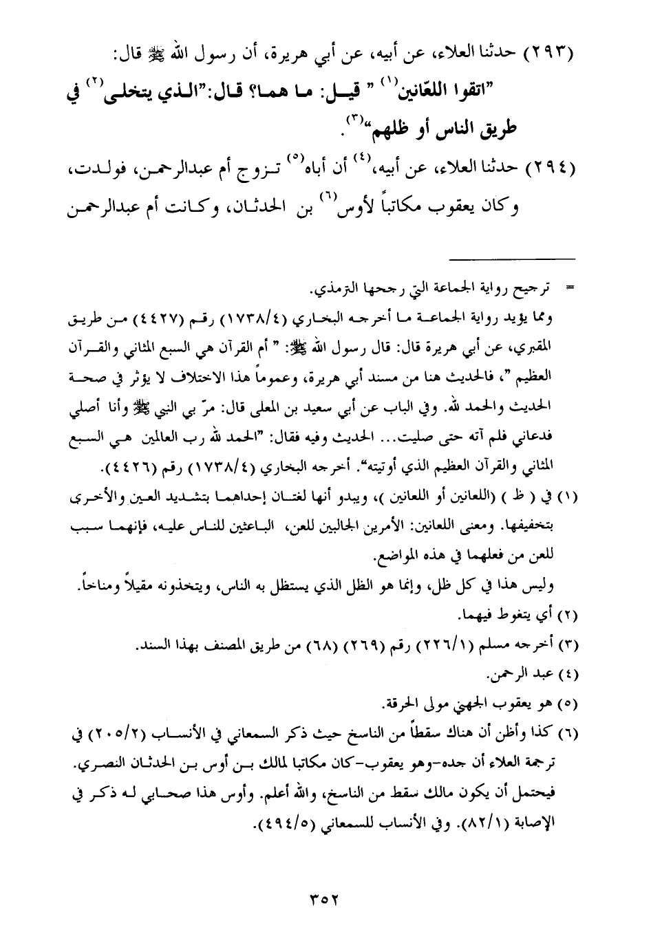 ٢٩٣ - حَدَّثَنَا الْعَلَاءُ، عَنْ أَبِيهِ، عَنْ أَبِي هُرَيْرَةَ أَنَّ رَسُولَ اللَّهِ صَلَّى اللهُ عَلَيْهِ وَسَلَّمَ قَالَ: «اتَّقُوا اللِّعَانَيْنِ» قِيلَ: مَا هُمَا؟ قَالَ: «الَّذِي يَتَخَلَّى فِي طَرِيقِ النَّاسِ أَوْ ظِلِّهِمْ»