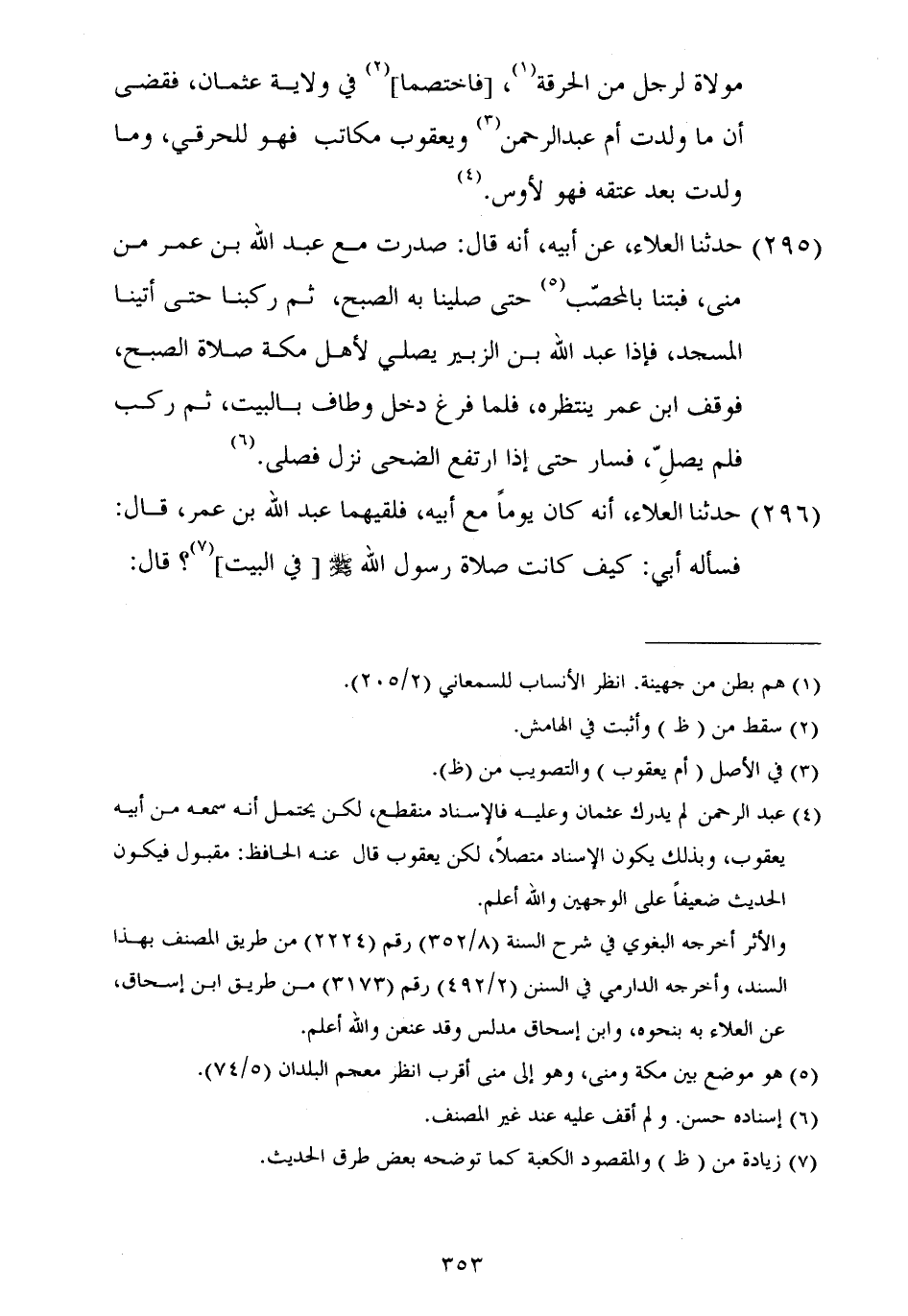 ٢٩٥ - حَدَّثَنَا الْعَلَاءُ، عَنْ أَبِيهِ، أَنَّهُ قَالَ: «صَدَرْتُ مَعَ عَبْدِ اللَّهِ بْنِ عُمَرَ مِنْ مِنًى، فَبِتْنَا بِالْمُحَصَّبِ حَتَّى صَلَّيْنَا بِهِ الصُّبْحَ، ثُمَّ رَكِبْنَا حَتَّى أَتَيْنَا الْمَسْجِدَ، فَإِذَا عَبْدُ اللَّهِ بْنُ الزُّبَيْرِ يُصَلِّي لِأَهْلِ مَكَّةَ صَلَاةَ الصُّبْحِ، فَوَقَفَ ابْنُ عُمَرَ يَنْتَظِرُهُ، فَلَمَّا فَرَغَ دَخَلَ وَطَافَ بِالْبَيْتِ، ثُمَّ رَكِبَ فَلَمْ يُصَلِّ، فَسَارَ حَتَّى إِذَا ارْتَفَعَ الضُّحَى نَزَلَ فَصَلَّى»