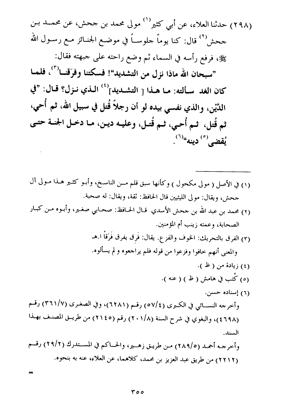 ٢٩٨ - حَدَّثَنَا الْعَلَاءُ، عَنْ أَبِي كَثِيرٍ مَوْلَى مُحَمَّدِ بْنِ جَحْشٍ، عَنْ مُحَمَّدِ بْنِ جَحْشٍ، قَالَ: كُنَّا يَوْمًا جُلُوسًا فِي مَوْضِعِ الْجَنَائِزِ مَعَ رَسُولِ اللَّهِ صَلَّى اللهُ عَلَيْهِ وَسَلَّمَ فَرَفَعَ رَأْسَهُ فِي السَّمَاءِ، ثُمَّ وَضَعَ رَاحَتَهُ عَلَى جَبْهَتِهِ فَقَالَ: «سُبْحَانَ اللَّهِ مَاذَا نَزَلَ مِنَ التَّشْدِيدِ» فَسَكَتْنَا وَفَرِقْنَا، فَلَمَّا كَانَ الْغَدُ سَأَلْتُهُ: مَا هَذَا التَّشْدِيدُ الَّذِي نَزَلَ؟ قَالَ: «فِي الدَّيْنِ، وَالَّذِي نَفْسِي بِيَدِهِ لَوْ أَنَّ رَجُلًا قُتِلَ فِي سَبِيلِ اللَّهِ، ثُمَّ أُحْيِيَ، ثُمَّ قُتِلَ، ثُمَّ أُحْيِيَ، ثُمَّ قُتِلَ، وَعَلَيْهِ دَيْنٌ، مَا دَخَلَ الْجَنَّةَ حَتَّى يُقْضَى دَيْنُهُ»