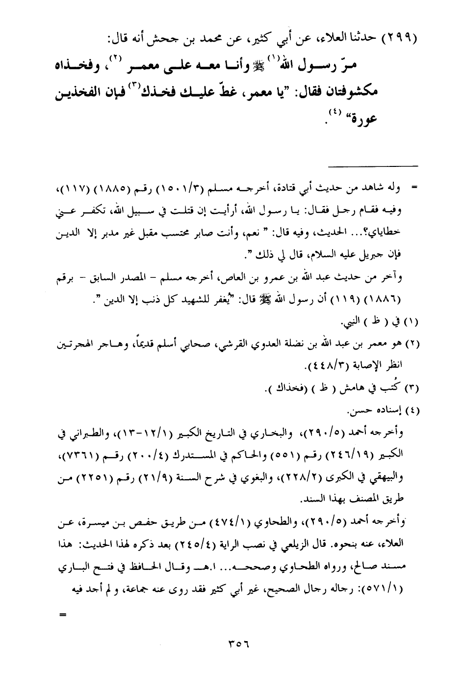 ٢٩٩ - حَدَّثَنَا الْعَلَاءُ، عَنْ أَبِي كَثِيرٍ، عَنْ مُحَمَّدِ بْنِ جَحْشٍ أَنَّهُ قَالَ: مَرَّ رَسُولُ اللَّهِ صَلَّى اللهُ عَلَيْهِ وَسَلَّمَ، وَأَنَا مَعَهُ عَلَى مَعْمَرٍ وَفَخِذَاهُ مَكْشُوفَتَانِ، فَقَالَ: «يَا مَعْمَرُ، غَطِّ عَلَيْكَ فَخِذَكَ فَإِنَّ الْفَخِذَيْنِ عَوْرَةٌ»
