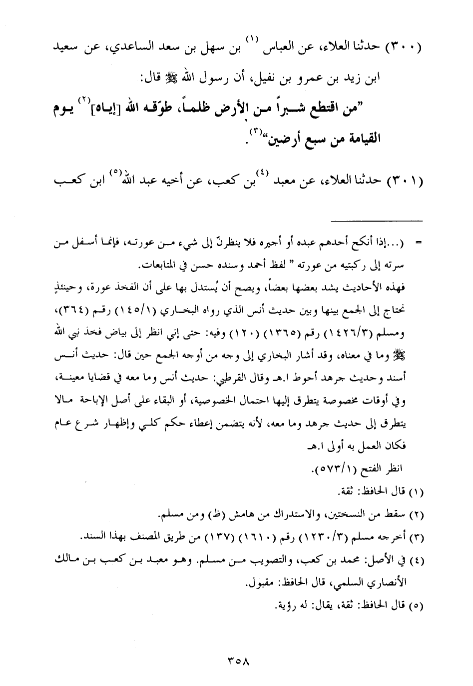 ٣٠٠ - حَدَّثَنَا الْعَلَاءُ، عَنِ الْعَبَّاسِ بْنِ سَهْلِ بْنِ سَعْدٍ السَّاعِدِيِّ، عَنْ سَعِيدِ بْنِ زَيْدِ بْنِ عَمْرِو بْنِ نُفَيْلٍ أَنَّ رَسُولَ اللَّهِ صَلَّى اللهُ عَلَيْهِ وَسَلَّمَ قَالَ: «مَنِ اقْتَطَعَ شِبْرًا مِنَ الْأَرْضِ ظُلْمًا، طَوَّقَهُ اللَّهُ إِيَّاهُ يَوْمَ الْقِيَامَةِ مِنْ سَبْعِ أَرَضِينَ»