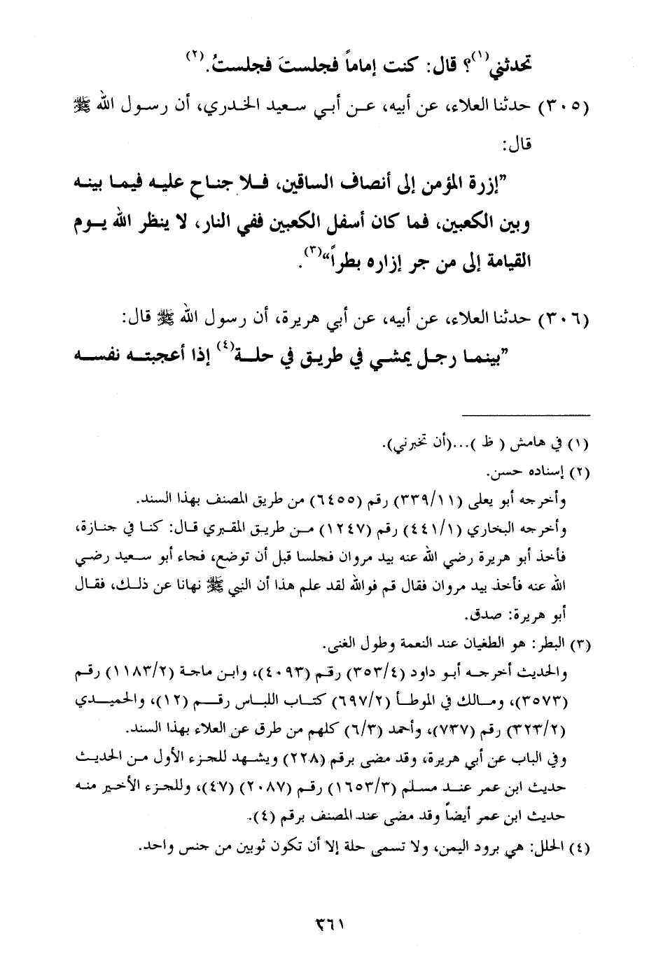 ٣٠٥ - حَدَّثَنَا الْعَلَاءُ، عَنْ أَبِيهِ، عَنْ أَبِي سَعِيدٍ الْخُدْرِيِّ أَنَّ رَسُولَ اللَّهِ صَلَّى اللهُ عَلَيْهِ وَسَلَّمَ قَالَ: «إِزْرَةُ الْمُؤْمِنِ إِلَى أَنْصَافِ السَّاقَيْنِ، فَلَا جُنَاحَ عَلَيْهِ فِيمَا بَيْنَهُ وَبَيْنَ الْكَعْبَيْنِ، فَمَا كَانَ أَسْفَلَ الْكَعْبَيْنِ فَفِي النَّارِ، لَا يَنْظُرُ اللَّهُ يَوْمَ الْقِيَامَةِ إِلَى مَنْ جَرَّ إِزَارَهُ بَطَرًا»