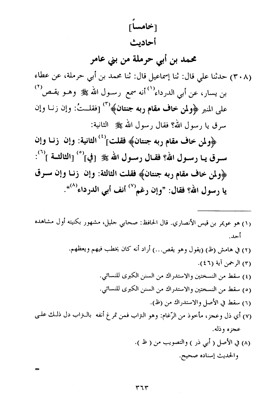 ٣٠٨ - حَدَّثَنَا عَلِيٌّ، قَالَ: ثنا إسماعيل قَالَ: ثنا مُحَمَّدُ بْنُ أَبِي حَرْمَلَةَ، عَنْ عَطَاءِ بْنِ يَسَارٍ، عَنْ أَبِي الدَّرْدَاءِ أَنَّهُ سَمِعَ رَسُولَ اللَّهِ صَلَّى اللهُ عَلَيْهِ وَسَلَّمَ، وَهُوَ يَقُصُّ عَلَى الْمِنْبَرِ {وَلِمَنْ خَافَ مَقَامَ رَبِّهِ جَنَّتَانِ} [الرحمن: ٤٦] فَقُلْتُ: وَإِنْ زَنَى وَإِنْ سَرَقَ يَا رَسُولَ اللَّهِ؟ فَقَالَ رَسُولُ اللَّهِ صَلَّى اللهُ عَلَيْهِ وَسَلَّمَ الثَّانِيَةَ: {وَلِمَنْ خَافَ مَقَامَ رَبِّهِ جَنَّتَانِ} [الرحمن: ٤٦] فَقُلْتُ الثَّانِيَةَ: وَإِنْ زَنَى وَإِنْ سَرَقَ يَا رَسُولَ اللَّهِ؟ فَقَالَ رَسُولُ اللَّهِ صَلَّى اللهُ عَلَيْهِ وَسَلَّمَ فِي الثَّالِثَةِ: {وَلِمَنْ خَافَ مَقَامَ رَبِّهِ جَنَّتَانِ} [الرحمن: ٤٦] فَقُلْتُ الثَّالِثَةَ: وَإِنْ زَنَى وَإِنْ سَرَقَ يَا رَسُولَ اللَّهِ؟ فَقَالَ: «وَإِنْ رَغِمَ أَنْفُ أَبِي الدَّرْدَاءِ»