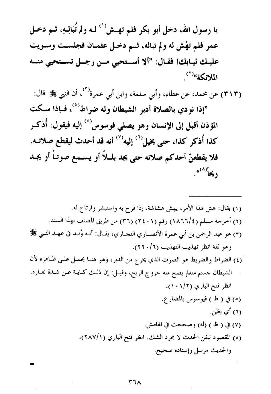 ٣١٣ - عَنْ مُحَمَّدٍ، عَنْ عَطَاءٍ، وَأَبِي سَلَمَةَ، وَابْنِ أَبِي عَمْرَةَ أَنَّ النَّبِيَّ صَلَّى اللهُ عَلَيْهِ وَسَلَّمَ قَالَ: " إِذَا نُودِيَ بِالصَّلَاةِ أَدْبَرَ الشَّيْطَانُ، وَلَهُ ضُرَاطٌ، فَإِذَا سَكَتَ الْمُؤَذِّنُ أَقْبَلَ إِلَى الْإِنْسَانِ وَهُوَ يُصَلِّي فَوَسْوَسَ إِلَيْهِ فَيَقُولُ: اذْكُرْ كَذَا اذْكُرْ كَذَا، حَتَّى يُخَيَّلَ إِلَيْهِ أَنَّهُ قَدْ أَحْدَثَ؛ لِيَقْطَعَ صَلَاتَهُ فَلَا يَقْطَعَنَّ أَحَدُكُمْ صَلَاتَهُ حَتَّى يَجِدَ بَلَلًا أَوْ يَسْمَعَ صَوْتًا أَوْ يَجِدَ رِيحًا "
