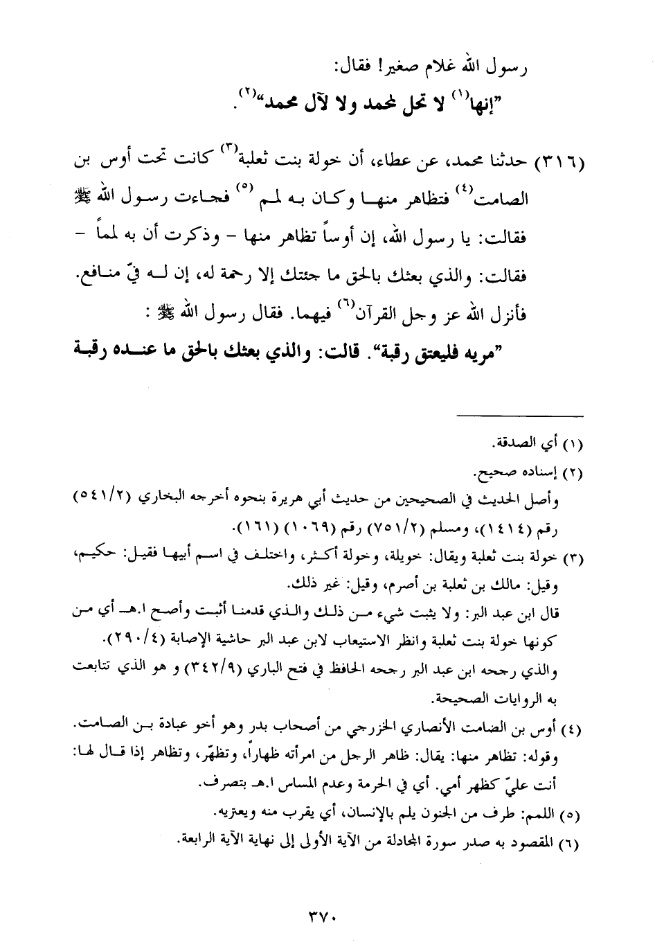 ٣١٦ - حَدَّثَنَا مُحَمَّدٌ، عَنْ عَطَاءٍ أَنَّ خَوْلَةَ بِنْتَ ثَعْلَبَةَ كَانَتْ تَحْتَ أَوْسِ بْنِ الصَّامِتِ فَتَظَاهَرَ مِنْهَا وَكَانَ بِهِ لَمَمٌ فَجَاءَتْ رَسُولَ اللَّهِ صَلَّى اللهُ عَلَيْهِ وَسَلَّمَ فَقَالَتْ: يَا رَسُولَ اللَّهِ، إِنَّ أَوْسًا تَظَاهَرَ مِنْهَا - وَذَكَرَتْ أَنَّ بِهِ لَمَمًا - فَقَالَتْ: وَالَّذِي بَعَثَكَ بِالْحَقِّ مَا جِئْتُكَ إِلَّا رَحْمَةً لَهُ، إِنَّ لَهُ فِيَّ مَنَافِعَ فَأَنْزَلَ اللَّهُ عَزَّ وَجَلَّ الْقُرْآنَ فِيهِمَا، فَقَالَ رَسُولُ اللَّهِ صَلَّى اللهُ عَلَيْهِ وَسَلَّمَ: «مُرِيهِ فَلْيُعْتِقْ رَقَبَةً» قَالَتْ: وَالَّذِي بَعَثَكَ بِالْحَقِّ مَا عِنْدَهُ رَقَبَةٌ ⦗٣٧١⦘ وَلَا يَمْلِكُهَا قَالَ: «مُرِيهِ فَلْيَصُمْ شَهْرَيْنِ مُتَتَابِعَيْنِ» قَالَتْ: وَالَّذِي بَعَثَكَ بِالْحَقِّ لَوْ كَلَّفْتَهُ ثَلَاثَةَ أَيَّامٍ مَا اسْتَطَاعَ، وَكَانَ الْحَرُّ قَالَ: «مُرِيهِ فَلْيُطْعِمْ سِتِّينَ مِسْكِينًا» قَالَتْ: وَالَّذِي بَعَثَكَ بِالْحَقِّ مَا يَقْدِرُ عَلَيْهِ قَالَ: «مُرِيهِ فَلْيَذْهَبْ إِلَى فُلَانِ ابْنِ فُلَانٍ، فَقَدْ أَخْبَرَنِي أَنَّ عِنْدَهُ شَطْرَ صَدَقَةٍ، فَلْيَأْخُذْهُ مِنْهُ صَدَقَةً عَلَيْهِ ثُمَّ لْيَتَصَدَّقْ بِهِ عَلَى سِتِّينَ مِسْكِينًا»