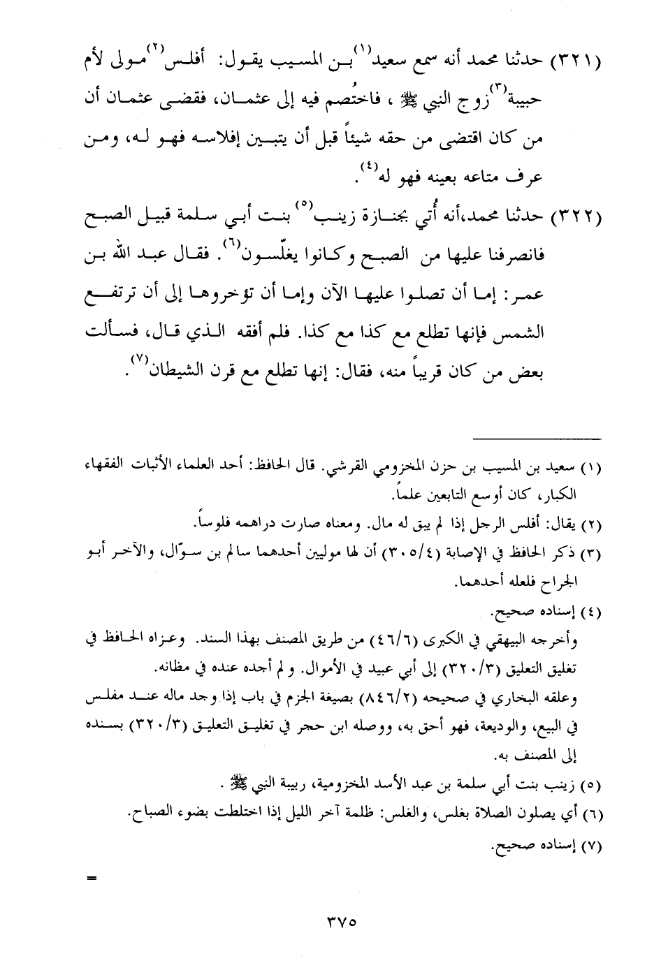٣٢١ - حَدَّثَنَا مُحَمَّدٌ، أَنَّهُ سَمِعَ سَعِيدَ بْنَ الْمُسَيِّبِ، يَقُولُ: «أَفْلَسَ مَوْلًى لِأُمِّ حَبِيبَةَ زَوْجِ النَّبِيِّ صَلَّى اللهُ عَلَيْهِ وَسَلَّمَ، فَاخْتُصِمَ فِيهِ إِلَى عُثْمَانَ، فَقَضَى عُثْمَانُ أَنَّ مَنْ كَانَ اقْتَضَى مِنْ حَقِّهِ شَيْئًا قَبْلَ أَنْ يَتَبَيَّنَ إِفْلَاسَهُ فَهُوَ لَهُ، وَمَنْ عَرَفَ مَتَاعَهُ بِعَيْنِهِ فَهُوَ لَهُ»