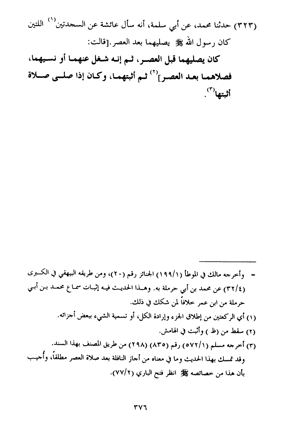 ٣٢٣ - حَدَّثَنَا مُحَمَّدٌ، عَنْ أَبِي سَلَمَةَ، أَنَّهُ سَأَلَ عَائِشَةَ عَنِ السَّجْدَتَيْنِ اللَّتَيْنِ كَانَ رَسُولُ اللَّهِ صَلَّى اللهُ عَلَيْهِ وَسَلَّمَ يُصَلِّيهِمَا بَعْدَ الْعَصْرِ قَالَتْ: «كَانَ يُصَلِّيهِمَا قَبْلَ الْعَصْرِ، ثُمَّ إِنَّهُ شُغِلَ عَنْهُمَا أَوْ نَسِيَهُمَا، فَصَلَّاهُمَا بَعْدَ الْعَصْرِ، ثُمَّ أَثْبَتَهُمَا، وَكَانَ إِذَا صَلَّى صَلَاةً أَثْبَتَهَا»