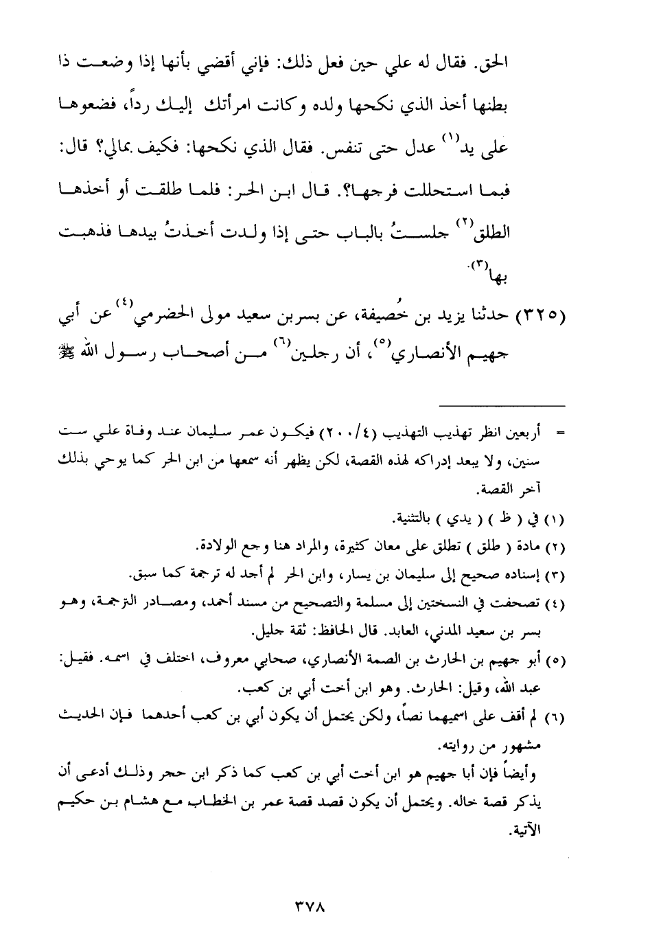 ٣٢٥ - حَدَّثَنَا يَزِيدُ بْنُ خُصَيْفَةَ، عَنْ بُسْرِ بْنِ سَعِيدٍ مَوْلَى الْحَضْرَمِيِّ عَنْ أَبِي جُهَيْمٍ الْأَنْصَارِيِّ أَنَّ رَجُلَيْنِ مِنْ أَصْحَابِ رَسُولِ اللَّهِ صَلَّى اللهُ عَلَيْهِ وَسَلَّمَ ⦗٣٧٩⦘ تَمَارَيَا فِي آيَةٍ مِنَ الْقُرْآنِ، كِلَاهُمَا يَزْعُمُ أَنَّهُ تَلَقَّاهَا مِنْ رَسُولِ اللَّهِ صَلَّى اللهُ عَلَيْهِ وَسَلَّمَ فَمَشِيَا جَمِيعًا حَتَّى أَتَيَا رَسُولَ اللَّهِ صَلَّى اللهُ عَلَيْهِ وَسَلَّمَ وَكِلَاهُمَا ذَكَرَ لِرَسُولِ اللَّهِ صَلَّى اللهُ عَلَيْهِ وَسَلَّمَ أَنَّهُ سَمِعَهَا مِنْهُ، فَذَكَرَ أَنَّ رَسُولَ اللَّهِ صَلَّى اللهُ عَلَيْهِ وَسَلَّمَ قَالَ: «إِنَّ هَذَا الْقُرْآنَ أُنْزِلَ عَلَى سَبْعَةِ أَحْرُفٍ، فَلَا تَتَمَارَوْا فِي الْقُرْآنِ، فَإِنَّ مِرَاءً فِيهِ كُفْرٌ»