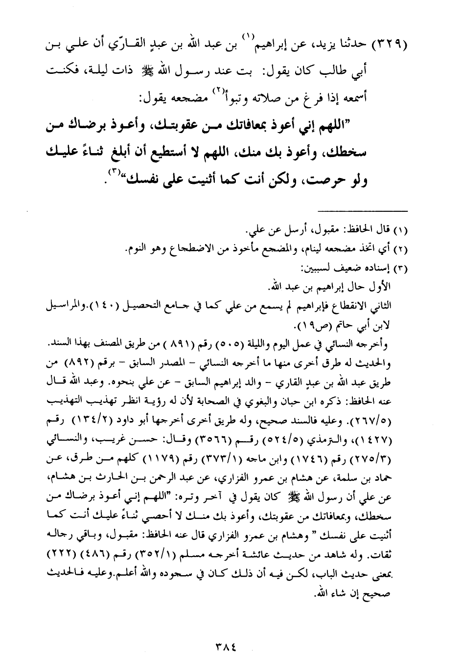 ٣٢٩ - حَدَّثَنَا يَزِيدُ، عَنْ إِبْرَاهِيمَ بْنِ عَبْدِ اللَّهِ بْنِ عَبْدٍ الْقَارِيِّ، أَنَّ عَلِيَّ بْنَ أَبِي طَالِبٍ، كَانَ يَقُولُ: بِتُّ عِنْدَ رَسُولِ اللَّهِ صَلَّى اللهُ عَلَيْهِ وَسَلَّمَ ذَاتَ لَيْلَةٍ، فَكُنْتُ أَسْمَعُهُ إِذَا فَرَغَ مِنْ صَلَاتِهِ وَتَبَوَّأَ مَضْجَعَهُ يَقُولُ: «اللَّهُمَّ إِنِّي أَعُوذُ بِمُعَافَاتِكَ مِنْ عُقُوبَتِكَ، وَأَعُوذُ بِرِضَاكَ مِنْ سَخَطِكَ، وَأَعُوذُ بِكَ مِنْكَ، اللَّهُمَّ لَا أَسْتَطِيعُ أَنْ أَبْلُغَ ثَنَاءً عَلَيْكَ وَلَوْ حَرَصْتُ، وَلَكِنْ أَنْتَ كَمَا أَثْنَيْتَ عَلَى نَفْسِكَ»