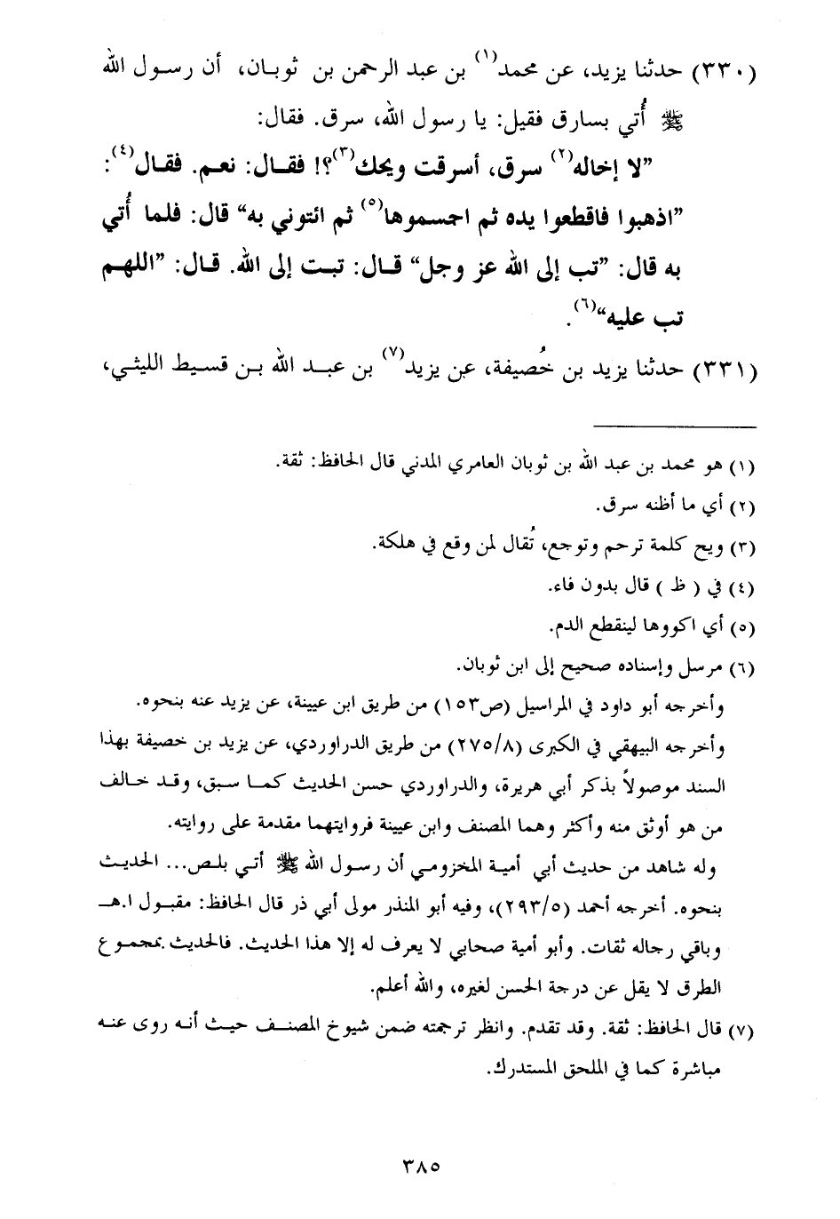 ٣٣٠ - حَدَّثَنَا يَزِيدُ، عَنْ مُحَمَّدِ بْنِ عَبْدِ الرَّحْمَنِ بْنِ ثَوْبَانَ أَنَّ رَسُولَ اللَّهِ صَلَّى اللهُ عَلَيْهِ وَسَلَّمَ أُتِيَ بِسَارِقٍ فَقِيلَ: يَا رَسُولَ اللَّهِ، سَرَقَ فَقَالَ: «لَا إِخَالُهُ سَرَقَ، أَسَرَقْتَ وَيْحَكَ؟» فَقَالَ، نَعَمْ، فَقَالَ: «اذْهَبُوا فَاقْطَعُوا يَدَهُ ثُمَّ اجْسِمُوهَا ثُمَّ ائْتُونِي بِهِ» قَالَ: فَلَمَّا أُتِيَ بِهِ قَالَ: «تُبْ إِلَى اللَّهِ عَزَّ وَجَلَّ» قَالَ: تُبْتُ إِلَى اللَّهِ قَالَ: «اللَّهُمَّ تُبْ عَلَيْهِ»