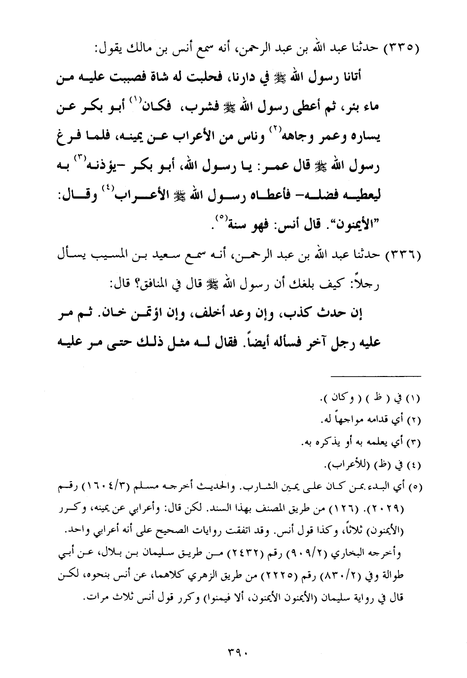 ٣٣٥ - حَدَّثَنَا عَبْدُ اللَّهِ بْنُ عَبْدِ الرَّحْمَنِ أَنَّهُ سَمِعَ أَنَسَ بْنَ مَالِكٍ، يَقُولُ: أَتَانَا رَسُولُ اللَّهِ صَلَّى اللهُ عَلَيْهِ وَسَلَّمَ فِي دَارِنَا، فَحَلَبْتُ لَهُ شَاةً فَصَبَبْتُ عَلَيْهِ مِنْ مَاءِ بِئْرٍ، ثُمَّ أُعْطِيَ رَسُولُ اللَّهِ صَلَّى اللهُ عَلَيْهِ وَسَلَّمَ فَشَرِبَ، فَكَانَ أَبُو بَكْرٍ عَنْ يَسَارِهِ وَعُمَرُ وِجَاهَهُ، وَنَاسٌ مِنَ الْأَعْرَابِ عَنْ يَمِينِهِ، فَلَمَّا فَرَغَ رَسُولُ اللَّهِ صَلَّى اللهُ عَلَيْهِ وَسَلَّمَ قَالَ عُمَرُ: يَا رَسُولَ اللَّهِ، أَبُو بَكْرٍ - يُؤْذِنُهُ بِهِ؛ لِيُعْطِيَهُ فَضْلَهُ -، فَأَعْطَاهُ رَسُولُ اللَّهِ صَلَّى اللهُ عَلَيْهِ وَسَلَّمَ الْأَعْرَابَ وَقَالَ: «الْأَيْمَنُونَ» قَالَ أَنَسٌ: فَهُوَ سُنَّةٌ