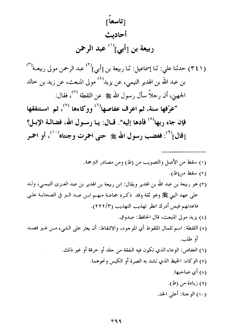٣٤١ - حَدَّثَنَا عَلِيٌّ، ثنا إِسْمَاعِيلُ، ثنا رَبِيعَةُ بْنُ أَبِي عَبْدِ الرَّحْمَنِ مَوْلَى رَبِيعَةَ بْنِ عَبْدِ اللَّهِ بْنِ الْهُدَيْرِ التَّيْمِيِّ، عَنْ يَزِيدَ مَوْلَى الْمُنْبَعِثِ، عَنْ زَيْدِ بْنِ خَالِدٍ الْجُهَنِيِّ أَنَّ رَجُلًا سَأَلَ رَسُولَ اللَّهِ صَلَّى اللهُ عَلَيْهِ وَسَلَّمَ عَنِ اللُّقَطَةِ، فَقَالَ: «عَرِّفْهَا سَنَةً، ثُمَّ اعْرِفْ عِفَاصَهَا وَوِكَاءَهَا، ثُمَّ اسْتَنْفِقْهَا فَإِنْ جَاءَ رَبُّهَا فَأَدِّهَا إِلَيْهِ» قَالَ: يَا رَسُولَ اللَّهِ، فَضَالَّةُ الْإِبِلِ؟ قَالَ: فَغَضِبَ رَسُولُ اللَّهِ صَلَّى اللهُ عَلَيْهِ وَسَلَّمَ حَتَّى احْمَرَّتْ وَجْنَتَاهُ، أَوِ احْمَرَّ ⦗٤٠٠⦘ وَجْهُهُ، ثُمَّ قَالَ، «مَا لَكَ وَلَهَا؟ مَعَهَا حِذَاؤُهَا وَسِقَاؤُهَا حَتَّى يَلْقَاهَا رَبُّهَا»