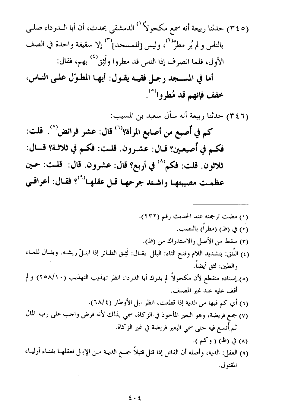 ٣٤٥ - حَدَّثَنَا رَبِيعَةُ، أَنَّهُ سَمِعَ مَكْحُولًا الدِّمَشْقِيَّ، يُحَدِّثُ، أَنَّ أَبَا الدَّرْدَاءِ صَلَّى بِالنَّاسِ وَلَمْ يُرَ مَطَرٌ، وَلَيْسَ لِلْمَسْجِدِ إِلَّا سَقِيفَةٌ وَاحِدَةٌ فِي الصَّفِّ الْأَوَّلِ، فَلَمَّا انْصَرَفَ إِذَا النَّاسُ قَدْ مُطِرُوا وَلَثِقَ بِهِمْ، فَقَالَ: أَمَا فِي الْمَسْجِدِ رَجُلٌ فَقِيهٌ يَقُولُ: «أَيُّهَا الْمُطَوِّلُ عَلَى النَّاسِ، خَفِّفْ فَإِنَّهُمْ قَدْ مُطِرُوا»