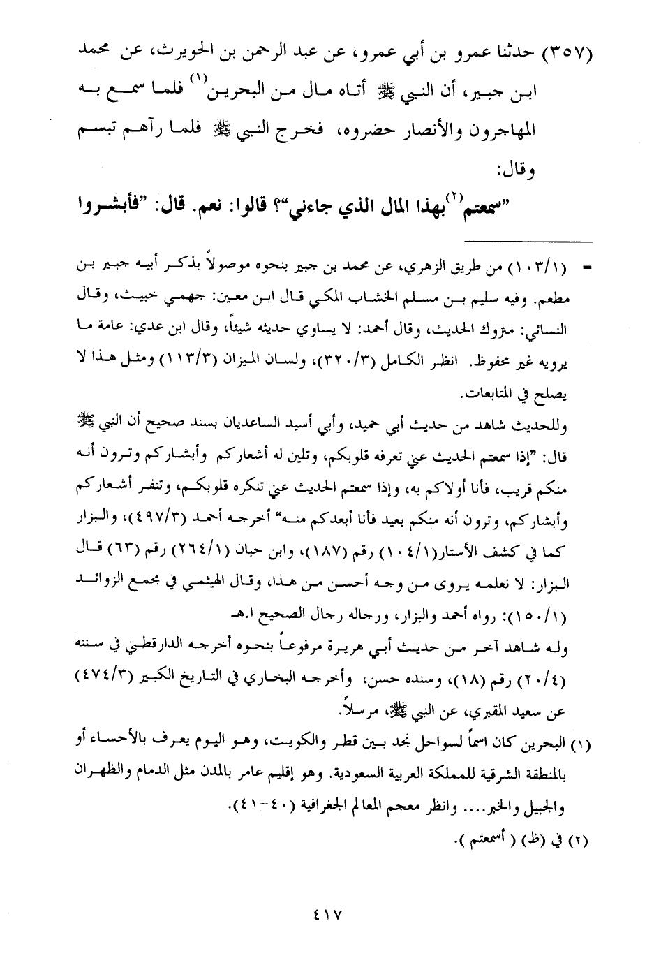 ٣٥٧ - حَدَّثَنَا عَمْرُو بْنُ أَبِي عَمْرٍو، عَنْ عَبْدِ الرَّحْمَنِ بْنِ الْحُوَيْرِثِ، عَنْ مُحَمَّدِ بْنِ جُبَيْرٍ أَنَّ النَّبِيَّ صَلَّى اللهُ عَلَيْهِ وَسَلَّمَ أَتَاهُ مَالٌ مِنَ الْبَحْرَيْنِ فَلَمَّا سَمِعَ بِهِ الْمُهَاجِرُونَ، وَالْأَنْصَارُ حَضَرُوهُ، فَخَرَجَ النَّبِيُّ صَلَّى اللهُ عَلَيْهِ وَسَلَّمَ فَلَمَّا رَآهُمْ تَبَسَّمَ وَقَالَ: «سَمِعْتُمْ بِهَذَا الْمَالِ الَّذِي جَاءَنِي؟» قَالُوا: نَعَمْ، قَالَ: «فَأَبْشِرُوا ⦗٤١٨⦘ وَأَمِّلُوا الَّذِي يَسُرُّكُمْ، فَوَالَّذِي نَفْسِي بِيَدِهِ، مَا أَخَافُ عَلَيْكُمُ الْفَقْرَ، وَلَكِنْ أَخَافُ عَلَيْكُمُ الدُّنْيَا أَنْ تُفْتَحَ عَلَيْكُمْ مِنْ هَا هُنَا، وَهَا هُنَا، فَتُعْجِبَكُمْ كَمَا أَعْجَبَتِ الَّذِينَ مِنْ قَبْلِكُمْ، وَتُهْلِكَكُمْ كَمَا أَهْلَكْتِ الَّذِينَ مِنْ قَبْلِكُمْ»