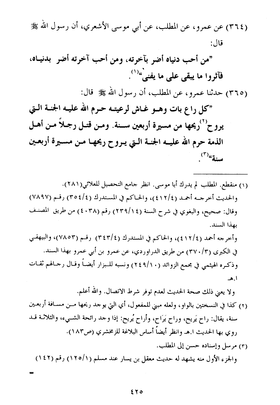 ٣٦٥ - حَدَّثَنَا عَمْرٌو، عَنِ الْمُطَّلِبِ أَنَّ رَسُولَ اللَّهِ صَلَّى اللهُ عَلَيْهِ وَسَلَّمَ قَالَ: «كُلُّ رَاعٍ بَاتَ وَهُوَ غَاشٌّ لِرَعِيَّتِهِ حَرَّمَ اللَّهُ عَلَيْهِ الْجَنَّةَ الَّتِي يَرُوحُ رِيحُهَا مِنْ مَسِيرَةِ أَرْبَعِينَ سَنَةً، وَمَنْ قَتَلَ رَجُلًا مِنْ أَهْلِ الذِّمَّةِ حَرَّمَ اللَّهُ عَلَيْهِ الْجَنَّةَ الَّتِي يَرُوحُ رِيحُهَا مِنْ مَسِيرَةِ أَرْبَعِينَ سَنَةً» . ⦗٤٢٦⦘