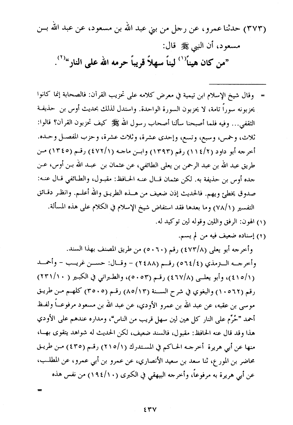 ٣٧٣ - حَدَّثَنَا عَمْرٌو، عَنْ رَجُلٍ مِنْ بَنِي عَبْدِ اللَّهِ بْنِ مَسْعُودٍ، عَنْ عَبْدِ اللَّهِ بْنِ مَسْعُودٍ أَنَّ النَّبِيَّ صَلَّى اللهُ عَلَيْهِ وَسَلَّمَ قَالَ: «مَنْ كَانَ هَيِّنًا لَيِّنًا سَهْلًا قَرِيبًا حَرَّمَهُ اللَّهُ عَلَى النَّارِ»