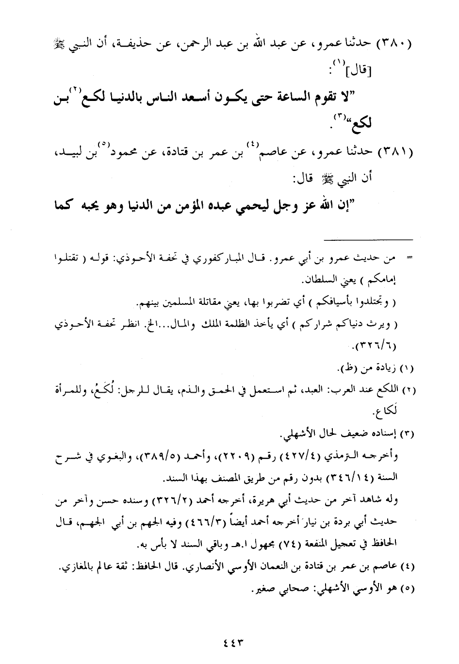٣٨٠ - حَدَّثَنَا عَمْرٌو، عَنْ عَبْدِ اللَّهِ بْنِ عَبْدِ الرَّحْمَنِ، عَنْ حُذَيْفَةَ أَنَّ النَّبِيَّ صَلَّى اللهُ عَلَيْهِ وَسَلَّمَ قَالَ: «لَا تَقُومُ السَّاعَةُ حَتَّى يَكُونَ أَسْعَدَ النَّاسِ بِالدُّنْيَا لُكَعُ ابْنُ لُكَعٍ»