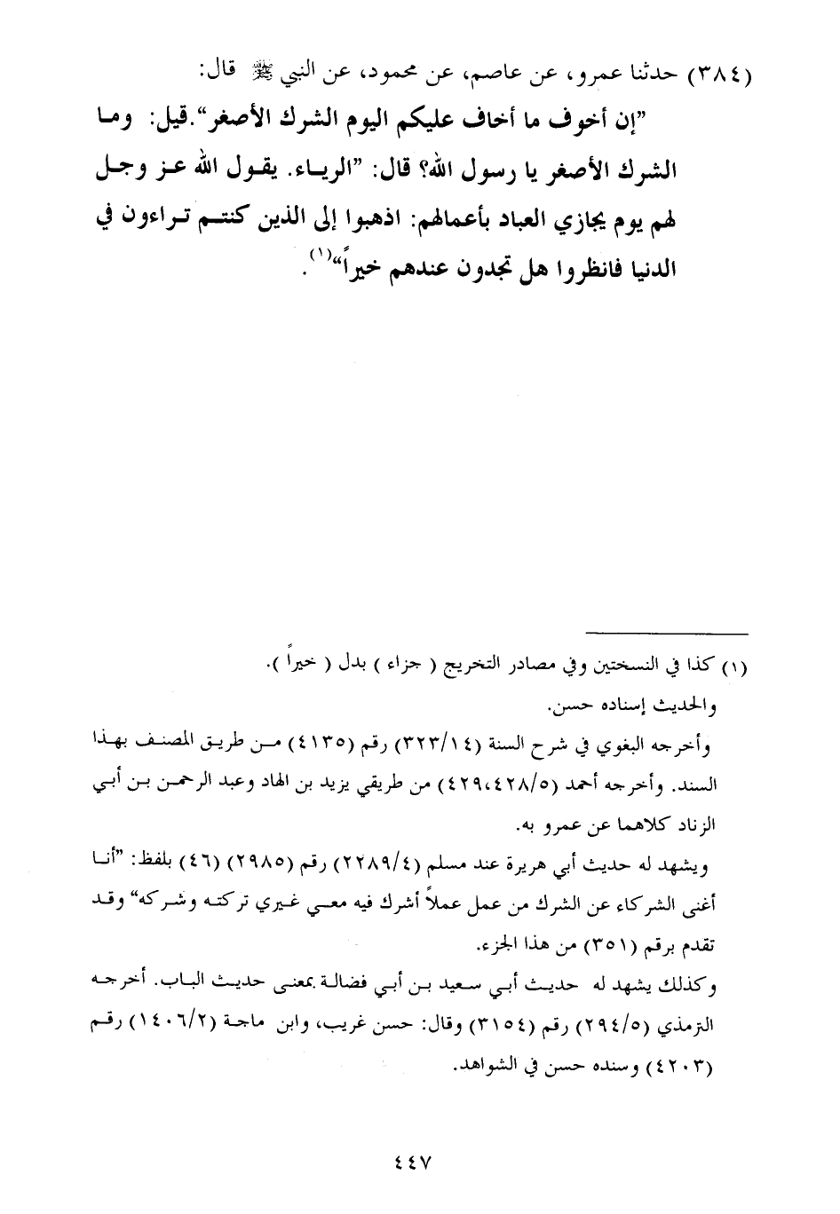 ٣٨٤ - حَدَّثَنَا عَمْرٌو، عَنْ عَاصِمٍ، عَنْ مَحْمُودٍ، عَنِ النَّبِيِّ صَلَّى اللهُ عَلَيْهِ وَسَلَّمَ قَالَ: «إِنَّ أَخْوَفَ مَا أَخَافُ عَلَيْكُمُ الْيَوْمَ الشِّرْكُ الْأَصْغَرُ» قِيلَ: وَمَا الشِّرْكُ الْأَصْغَرُ يَا رَسُولَ اللَّهِ؟ " قَالَ: " الرِّيَاءُ يَقُولُ اللَّهُ عَزَّ وَجَلَّ لَهُمْ يَوْمَ يُجَازَى الْعِبَادُ بِأَعْمَالِهِمُ: اذْهَبُوا إِلَى الَّذِينَ كُنْتُمْ تُرَاءُونَ فِي الدُّنْيَا، فَانْظُرُوا هَلْ تَجِدُونَ عِنْدَهُمْ خَيْرًا؟ "