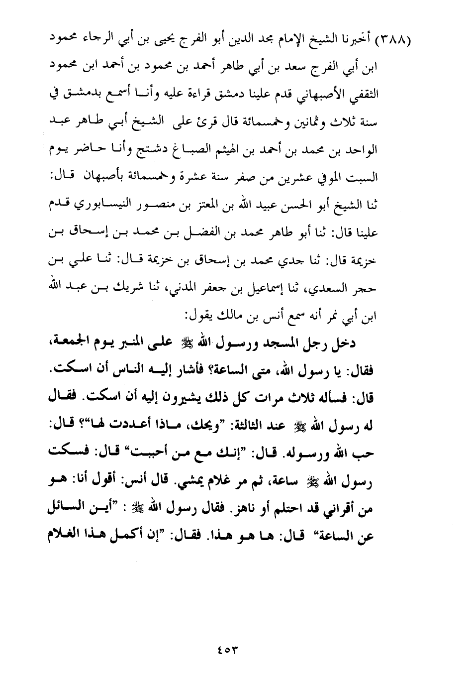 ٣٨٨ - أَخْبَرَنَا الشَّيْخُ الْإِمَامُ مَجْدُ الدِّينِ أَبُو الْفَرَجِ يَحْيَى بْنُ أَبِي الرَّجَاءِ مَحْمُودُ بْنُ أَبِي الْفَرَجِ سَعْدُ بْنُ أَبِي طَاهِرٍ أَحْمَدَ بْنِ مَحْمُودِ بْنِ أَحْمَدَ بْنِ مَحْمُودٍ الثَّقَفِيُّ الْأَصْبَهَانِيُّ، قَدِمَ عَلَيْنَا دِمَشْقَ قِرَاءَةً عَلَيْهِ بِهَا وَأَنَا أَسْمَعُ بِدِمَشْقَ فِي سَنَةِ ثَلَاثٍ وَثَمَانِينَ وَخَمْسِمِائَةٍ، قَالَ: قُرِئَ عَلَى الشَّيْخِ أَبِي طَاهِرٍ عَبْدِ الْوَاحِدِ بْنِ مُحَمَّدِ بْنِ أَحْمَدَ بْنِ الْهَيْثَمِ الصَّبَّاغِ دَشْتَجَ، وَأَنَا حَاضِرٌ يَوْمَ السَّبْتِ الْمُوفِي عِشْرِينَ مِنْ صَفَرٍ سَنَةَ عَشْرَةٍ وَخَمْسِمِائَةٍ بِأَصْبَهَانَ قَالَ: ثنا الشَّيْخُ أَبُو الْحَسَنِ عُبَيْدُ اللَّهِ بْنُ الْمُعْتَزِّ بْنِ مَنْصُورٍ النَّيْسَابُورِيُّ، قَدِمَ عَلَيْنَا قَالَ: ثنا أَبُو طَاهِرٍ مُحَمَّدُ بْنُ الْفَضْلِ بْنِ مُحَمَّدِ بْنِ إِسْحَاقَ بْنِ خُزَيْمَةَ قَالَ: ثنا جَدِّي مُحَمَّدُ بْنُ إِسْحَاقَ بْنِ خُزَيْمَةَ، قَالَ: ثنا عَلِيُّ بْنُ حُجْرٍ السَّعْدِيُّ، ثنا إِسْمَاعِيلُ بْنُ جَعْفَرٍ الْمَدَنِيُّ، ثنا شَرِيكُ بْنُ عَبْدِ اللَّهِ بْنِ أَبِي نَمِرٍ أَنَّهُ سَمِعَ أَنَسَ بْنَ مَالِكٍ يَقُولُ: دَخَلَ رَجُلٌ الْمَسْجِدَ، وَرَسُولُ اللَّهِ صَلَّى اللهُ عَلَيْهِ وَسَلَّمَ عَلَى الْمِنْبَرِ يَوْمَ الْجُمُعَةِ، فَقَالَ: يَا رَسُولَ اللَّهِ، مَتَى السَّاعَةُ؟ فَأَشَارَ إِلَيْهِ النَّاسُ أَنِ اسْكُتْ، قَالَ: فَسَأَلَهُ ثَلَاثَ مَرَّاتٍ كُلُّ ذَلِكَ يُشِيرُونَ إِلَيْهِ أَنِ اسْكُتْ، فَقَالَ لَهُ رَسُولُ اللَّهِ صَلَّى اللهُ عَلَيْهِ وَسَلَّمَ عِنْدَ الثَّالِثَةِ: «وَيْحَكَ مَاذَا أَعْدَدْتَ لَهَا؟» قَالَ: حُبَّ اللَّهِ وَرَسُولِهِ، قَالَ: «إِنَّكَ مَعَ مَنْ أَحْبَبْتَ» قَالَ: فَسَكَتَ رَسُولُ اللَّهِ صَلَّى اللهُ عَلَيْهِ وَسَلَّمَ سَاعَةً، ثُمَّ مَرَّ غُلَامٌ يَمْشِي قَالَ أَنَسٌ: أَقُولُ أَنَا: هُوَ مِنْ أَقْرَانِي قَدِ احْتَلَمَ أَوْ نَاهَزَ فَقَالَ رَسُولُ اللَّهِ صَلَّى اللهُ عَلَيْهِ وَسَلَّمَ: «أَيْنَ السَّائِلُ عَنِ السَّاعَةِ؟» قَالَ: هَا هُوَ هَذَا، فَقَالَ: «إِنْ أَكْمَلَ هَذَا الْغُلَامُ ⦗٤٥٤⦘ عُمْرَهُ أَوْ أَدْرَكَ عُمْرَهُ، فَلَنْ يَمُوتَ حَتَّى يَرَى أَشْرَاطَهَا»