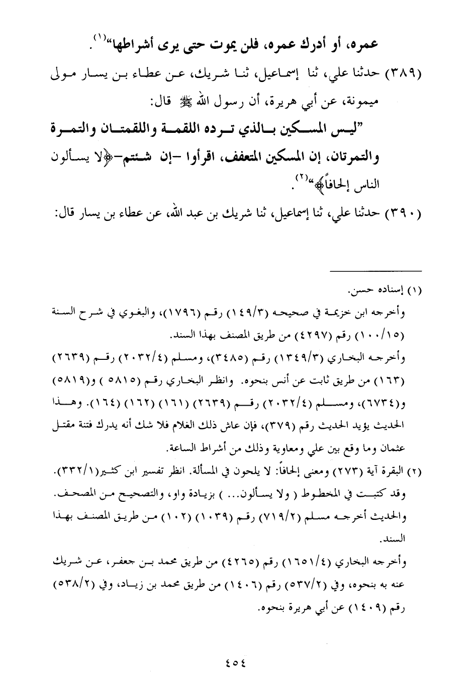 ٣٨٩ - حَدَّثَنَا عَلِيٌّ، ثنا إِسْمَاعِيلُ، ثنا شَرِيكٌ، عَنْ عَطَاءِ بْنِ يَسَارٍ مَوْلَى مَيْمُونَةَ، عَنْ أَبِي هُرَيْرَةَ أَنَّ رَسُولَ اللَّهِ صَلَّى اللهُ عَلَيْهِ وَسَلَّمَ قَالَ: " لَيْسَ الْمِسْكِينُ بِالَّذِي تَرُدُّهُ اللُّقْمَةُ، وَاللُّقْمَتَانِ، وَالتَّمْرَةُ وَالتَّمْرَتَانِ، إِنَّ الْمِسْكِينَ الْمُتَعَفِّفُ، اقْرَءُوا، إِنْ شِئْتُمْ {لَا يَسْأَلُونَ النَّاسَ إِلْحَافًا} [البقرة: ٢٧٣] "