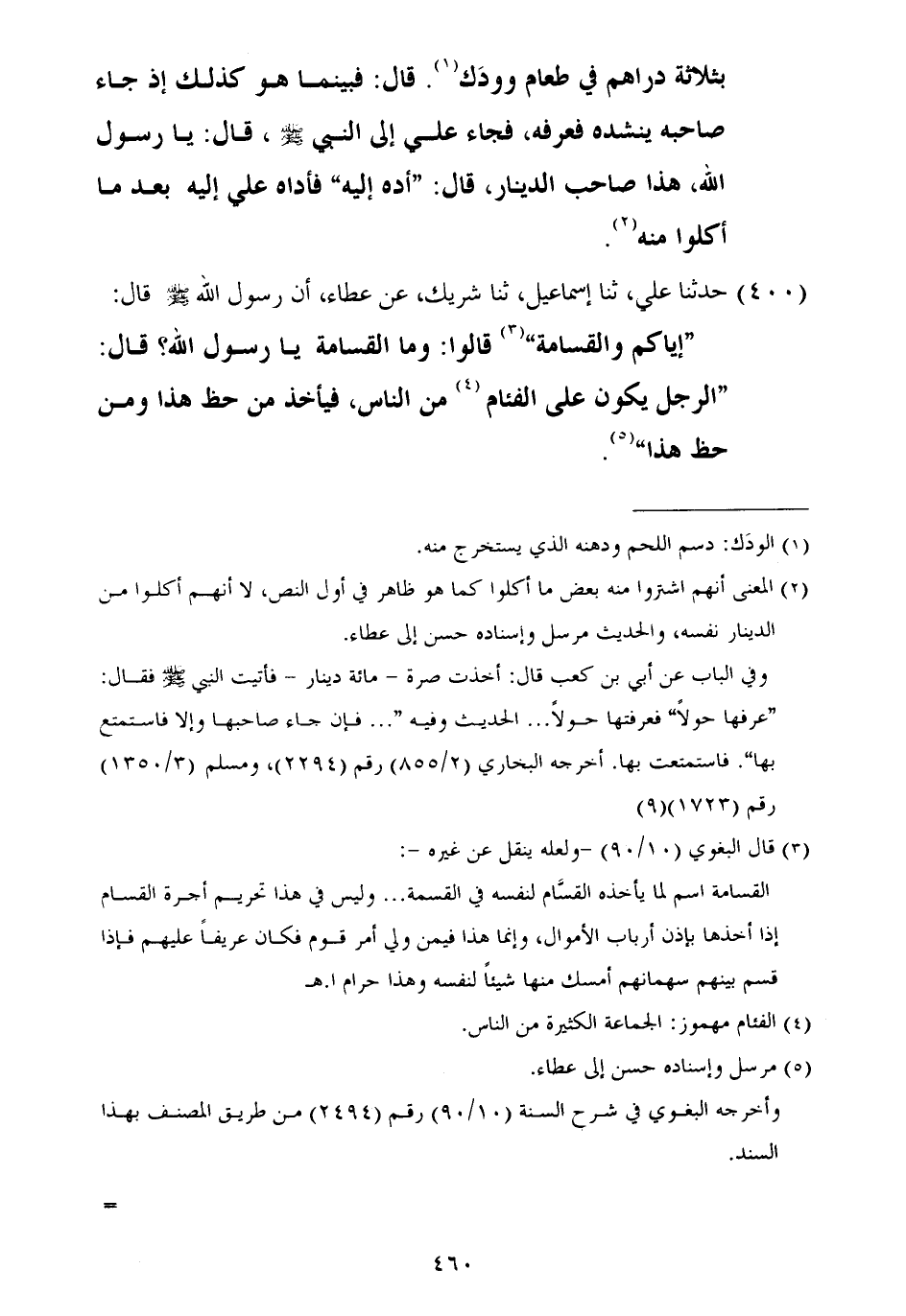 ٤٠٠ - حَدَّثَنَا عَلِيٌّ، ثنا إِسْمَاعِيلُ، ثنا شَرِيكٌ، عَنْ عَطَاءٍ أَنَّ رَسُولَ اللَّهِ صَلَّى اللهُ عَلَيْهِ وَسَلَّمَ قَالَ: «إِيَّاكُمْ وَالْقُسَامَةَ» قَالُوا: وَمَا الْقُسَامَةُ يَا رَسُولَ اللَّهِ؟ قَالَ: «الرَّجُلُ يَكُونُ عَلَى الْفِئَامِ مِنَ النَّاسِ، فَيَأْخُذُ مِنْ حَظِّ هَذَا، وَمَنْ حَظِّ هَذَا»