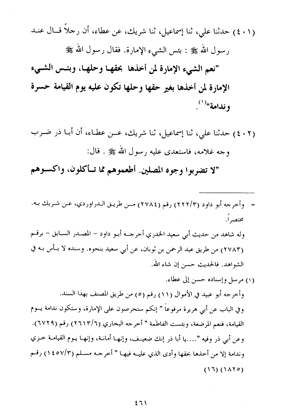 ٤٠١ - حَدَّثَنَا عَلِيٌّ، ثنا إِسْمَاعِيلُ، ثنا شَرِيكٌ، عَنْ عَطَاءٍ أَنَّ رَجُلًا قَالَ عِنْدَ رَسُولِ اللَّهِ صَلَّى اللهُ عَلَيْهِ وَسَلَّمَ: بِئْسَ الشَّيْءُ الْإِمَارَةُ، فَقَالَ رَسُولُ اللَّهِ صَلَّى اللهُ عَلَيْهِ وَسَلَّمَ: «نِعْمَ الشَّيْءُ الْإِمَارَةُ لِمَنْ أَخَذَهَا بِحَقِّهَا وَحِلِّهَا، وَبِئْسَ الشَّيْءُ الْإِمَارَةُ لِمَنْ أَخَذَهَا بِغَيْرِ حَقِّهَا وَحِلِّهَا تَكُونُ عَلَيْهِ يَوْمَ الْقِيَامَةِ حَسْرَةً وَنَدَامَةً»