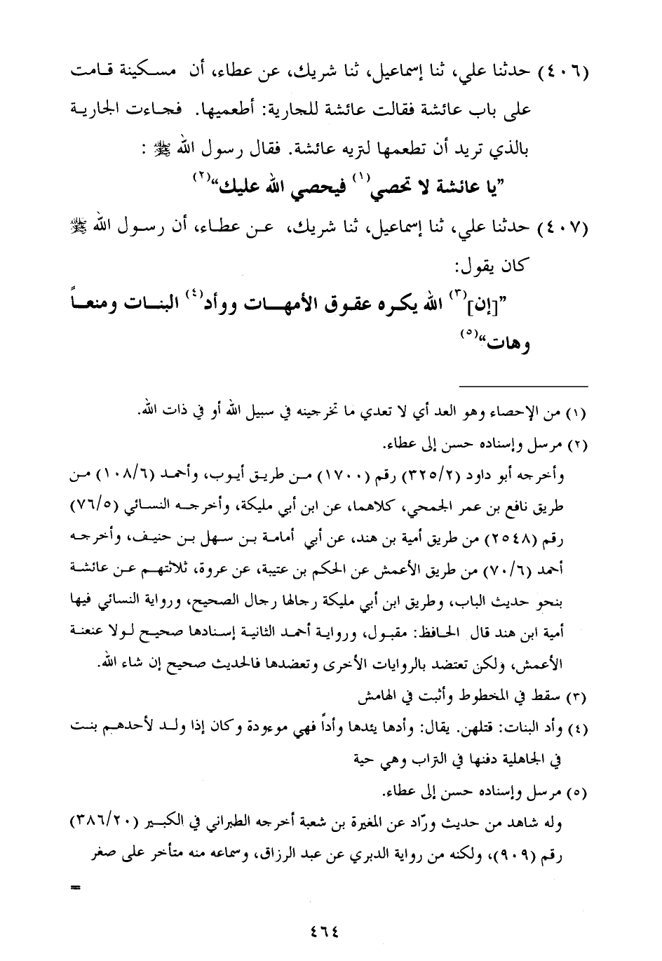 ٤٠٧ - حَدَّثَنَا عَلِيٌّ، ثنا إِسْمَاعِيلُ، ثنا شَرِيكٌ، عَنْ عَطَاءٍ أَنَّ رَسُولَ اللَّهِ صَلَّى اللهُ عَلَيْهِ وَسَلَّمَ كَانَ يَقُولُ: «إِنَّ اللَّهَ يَكْرَهُ عُقُوقَ الْأُمَّهَاتِ، وَوَأْدِ الْبَنَاتِ وَمَنْعًا وَهَاتِ»