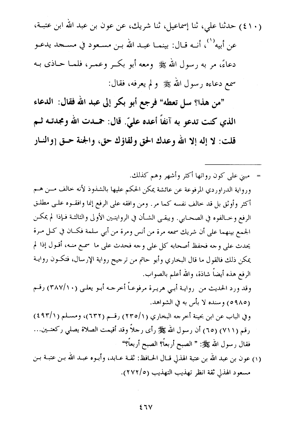 ٤١٠ - حَدَّثَنَا عَلِيٌّ، ثنا إِسْمَاعِيلُ، ثنا شَرِيكٌ، عَنْ عَوْنِ بْنِ عَبْدِ اللَّهِ بْنِ عُتْبَةَ، عَنْ أَبِيهِ، أَنَّهُ قَالَ: بَيْنَمَا عَبْدُ اللَّهِ بْنُ مَسْعُودٍ فِي مَسْجِدٍ يَدْعُو دُعَاءً مَرَّ بِهِ رَسُولُ اللَّهِ صَلَّى اللهُ عَلَيْهِ وَسَلَّمَ، وَمَعَهُ أَبُو بَكْرٍ، وَعُمَرُ، فَلَمَّا حَاذَى بِهِ سَمِعَ دُعَاءَهُ رَسُولُ اللَّهِ صَلَّى اللهُ عَلَيْهِ وَسَلَّمَ وَلَمْ يَعْرِفْهُ، فَقَالَ: «مَنْ هَذَا؟ سَلْ تُعْطَهْ» فَرَجَعَ أَبُو بَكْرٍ إِلَى عَبْدِ اللَّهِ فَقَالَ: الدُّعَاءُ الَّذِي كُنْتَ تَدْعُو بِهِ آنِفًا أَعِدْهُ عَلَيَّ قَالَ: حَمَدْتُ اللَّهَ وَمَجَّدْتُهُ، ثُمَّ قُلْتُ: لَا إِلَهَ إِلَّا اللَّهُ، وَعَدُكَ الْحَقُّ وَلِقَاؤُكَ حَقٌّ، وَالْجَنَّةُ حَقٌّ، وَالنَّارٌ ⦗٤٦٨⦘ حَقٌّ، وَرُسُلُكَ حَقٌّ، وَكِتَابُكَ حَقٌّ، وَالنَّبِيُّونَ حَقٌّ، وَمُحَمَّدٌ حَقٌّ