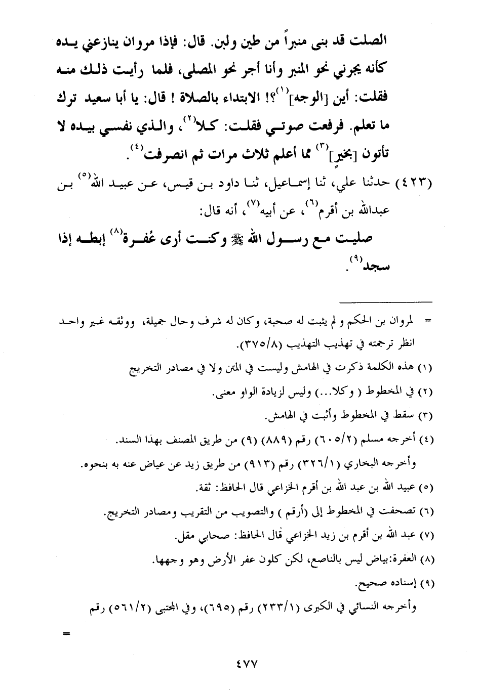 ٤٢٣ - حَدَّثَنَا عَلِيٌّ، ثنا إِسْمَاعِيلُ، ثنا دَاوُدُ بْنُ قَيْسٍ، عَنْ عُبَيْدِ اللَّهِ بْنِ عَبْدِ اللَّهِ بْنِ أَقْرَمَ، عَنْ أَبِيهِ أَنَّهُ قَالَ: «صَلَّيْتُ مَعَ رَسُولِ اللَّهِ صَلَّى اللهُ عَلَيْهِ وَسَلَّمَ، وَكُنْتُ أَرَى عُفْرَةَ إِبْطِهِ إِذَا سَجَدَ»
