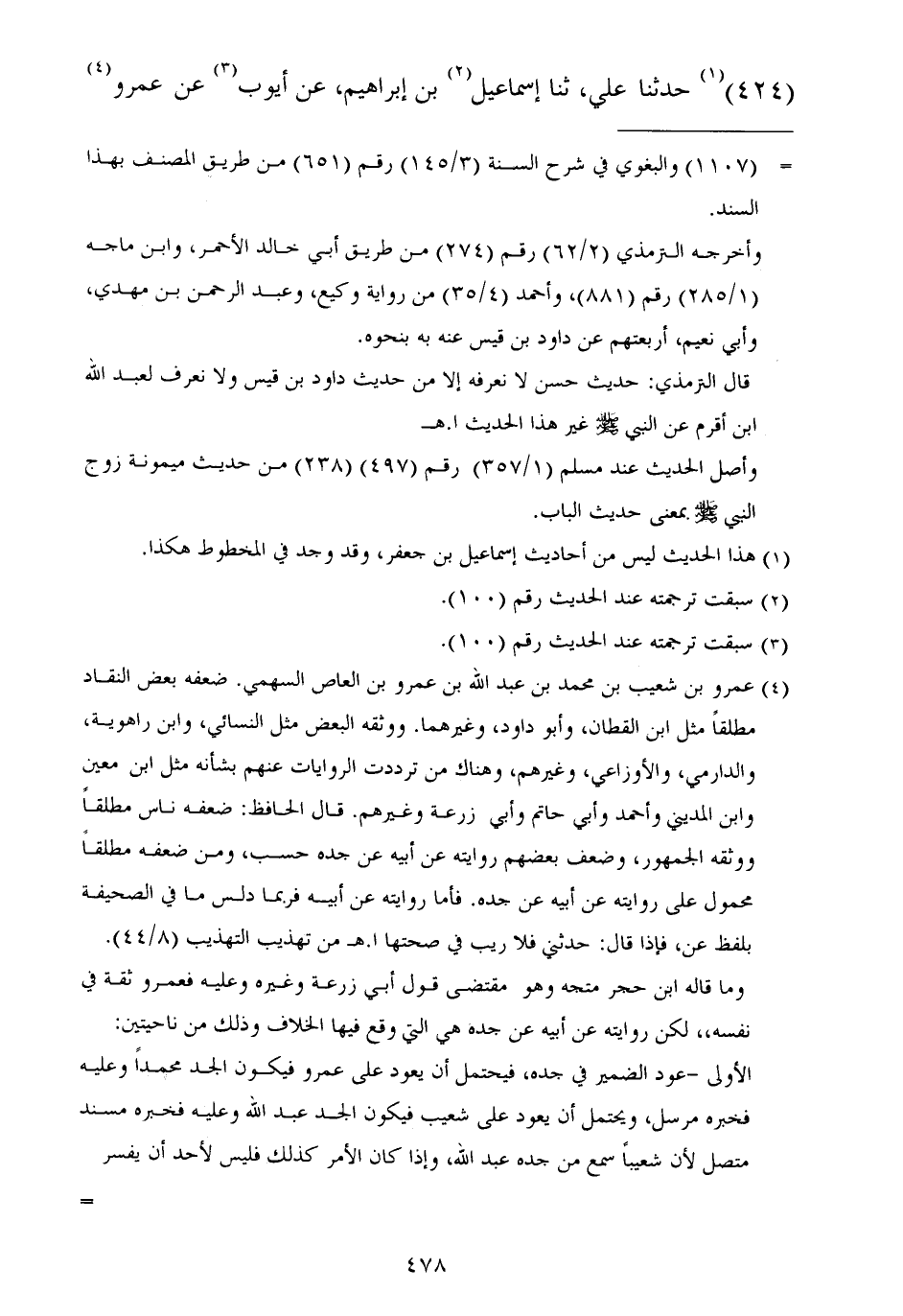 ٤٢٤ - حَدَّثَنَا عَلِيٌّ، ثنا إِسْمَاعِيلُ بْنُ إِبْرَاهِيمَ، عَنْ أَيُّوبَ، عَنْ عَمْرِو ⦗٤٨٠⦘ بْنِ شُعَيْبٍ، قَالَ: حَدَّثَنِي أَبِي، عَنْ أَبِيهِ حَتَّى ذَكَرَ عَبْدَ اللَّهِ بْنَ عَمْرٍو قَالَ: «نَهَى رَسُولُ اللَّهِ صَلَّى اللهُ عَلَيْهِ وَسَلَّمَ عَنْ سَلَفٍ وَبَيْعٍ، وَعَنْ شَرْطَيْنِ فِي بَيْعٍ، وَعَنْ بَيْعِ مَا لَيْسَ عِنْدَكَ، وَعَنْ شَفِّ مَا لَمْ يُضْمَنْ»