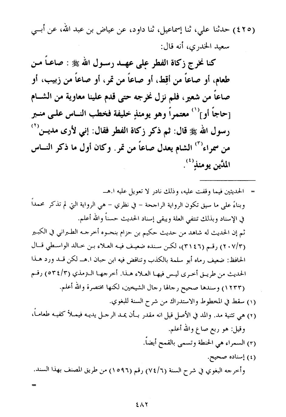 ٤٢٥ - حَدَّثَنَا عَلِيٌّ، ثنا إِسْمَاعِيلُ، ثنا دَاوُدُ، عَنْ عِيَاضِ بْنِ عَبْدِ اللَّهِ، عَنْ أَبِي سَعِيدٍ الْخُدْرِيِّ أَنَّهُ قَالَ: كُنَّا نُخْرِجُ زَكَاةَ الْفِطْرِ عَلَى عَهْدِ رَسُولِ اللَّهِ صَلَّى اللهُ عَلَيْهِ وَسَلَّمَ: صَاعًا مِنْ طَعَامٍ، أَوْ صَاعًا مِنْ أَقِطٍ، أَوْ صَاعًا مِنْ تَمْرٍ، أَوْ صَاعًا مِنْ زَبِيبٍ، أَوْ صَاعًا مِنْ شَعِيرٍ، فَلَمْ نَزَلْ نُخْرِجُهُ حَتَّى قَدِمَ عَلَيْنَا مُعَاوِيَةُ مِنَ الشَّامِ حَاجًّا أَوْ مُعْتَمِرًا، وَهُوَ يَوْمَئِذٍ خَلِيفَةٌ فَخَطَبَ النَّاسَ عَلَى مِنْبَرِ رَسُولِ اللَّهِ صَلَّى اللهُ عَلَيْهِ وَسَلَّمَ قَالَ: ثُمَّ ذَكَرَ زَكَاةَ الْفِطْرِ فَقَالَ: إِنِّي لَأَرَى مُدَّيْنِ مِنْ سَمْرَاءِ الشَّامِ يَعْدِلُ صَاعًا مِنْ تَمْرٍ، وَكَانَ أَوَّلَ مَا ذَكَرَ النَّاسُ الْمُدَّيْنِ يَوْمَئِذٍ "