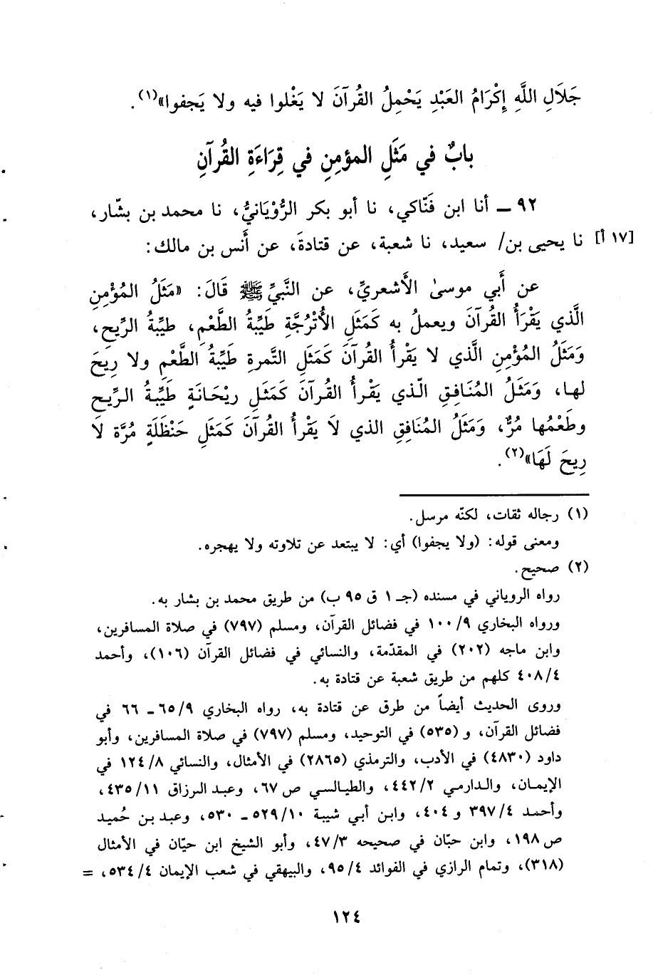 92 - أنا ابْنُ فناكي، نا أَبُو بَكْرٍ الرُّويَانِيُّ، نا مُحَمَّدُ بْنُ بَشَّارٍ، نا يَحْيَى بْنُ سَعِيدٍ، نا شُعْبَةُ، عَنْ قَتَادَةَ، عَنْ أَنَسِ بْنِ مَالِكٍ، عَنْ أَبِي مُوسَى الأَشْعَرِيِّ، عَنِ النَّبِيِّ صَلَّى اللَّهُ عَلَيْهِ وَسَلَّمَ، قَالَ: «§مَثَلُ الْمُؤْمِنِ الَّذِي يَقْرَأُ الْقُرْآنَ وَيَعْمَلُ بِهِ كَمَثَلِ الأترجةِ، طَيِّبَةُ الطَّعْمِ، طَيِّبَةُ الرِّيحِ، وَمَثَلُ الْمُؤْمِنِ الَّذِي لا يَقْرَأُ الْقُرْآنِ كَمَثَلِ التَّمْرَةِ، طَيِّبَةُ الطَّعْمِ وَلا رِيحَ لَهَا، وَمَثَلُ الْمُنَافِقِ الَّذِي يَقْرَأُ الْقُرْآنَ كَمَثَلِ رَيْحَانَةٍ، طَيِّبَةُ الرِّيحِ وَطَعْمُهَا مُرٌّ، وَمَثَلُ الْمُنَافِقِ الَّذِي لا يَقْرَأُ الْقُرْآنَ كَمَثَلِ حَنْظَلَةٍ، مُرَّةٌ لا رِيحَ لَهَا» .