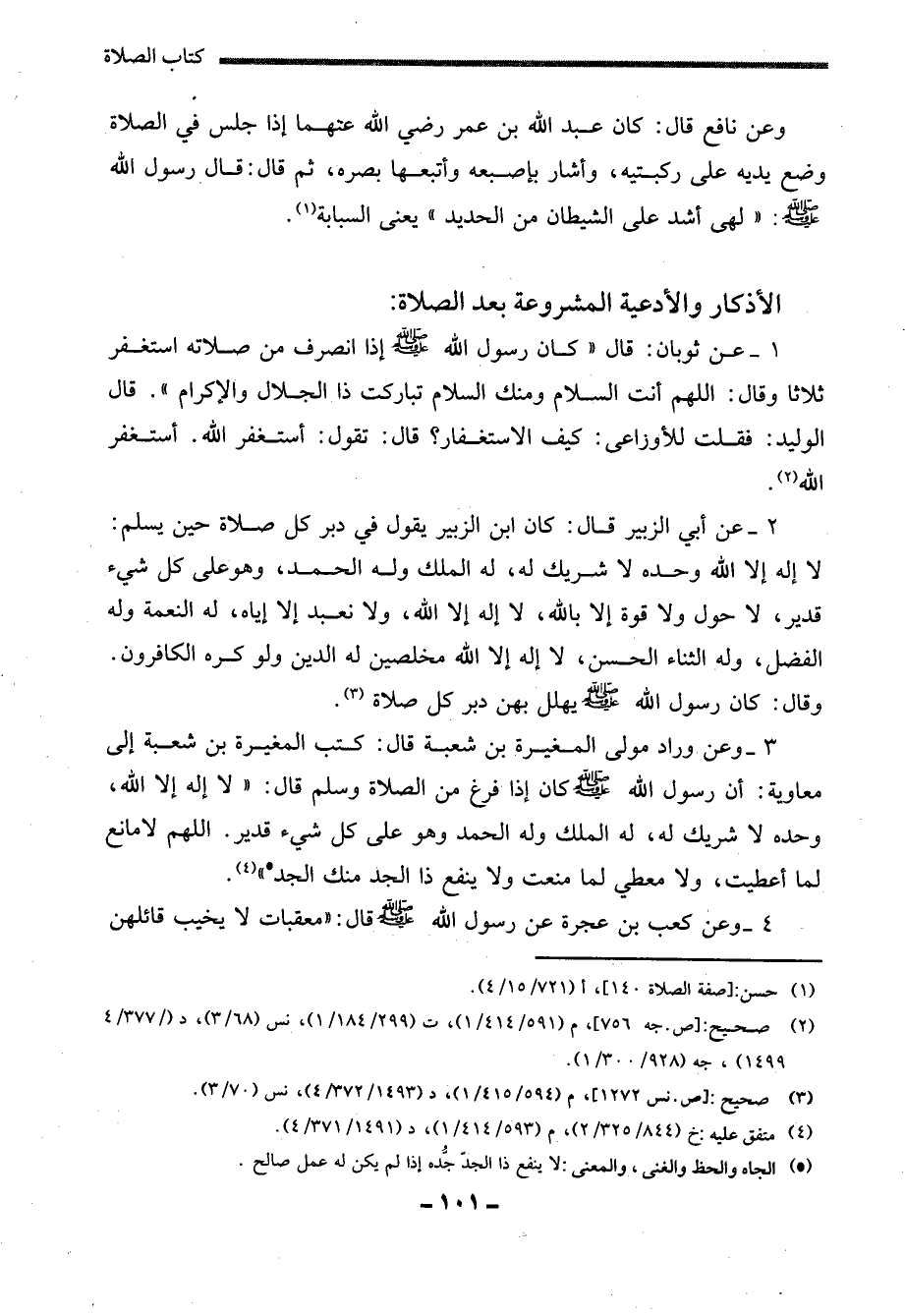 1 - عن ثوبان: قال "كان رسول الله - صلى الله عليه وسلم - إذا انصرف من صلاته استغفر ثلاثا وقال: اللهم أنت السلام ومنك السلام تباركت ذا الجلال والإكرام". قال الوليد: فقلت للأوزاعى: كيف الاستغفار؟ قال: تقول: أستغفر الله. أستغفر الله (¬2).