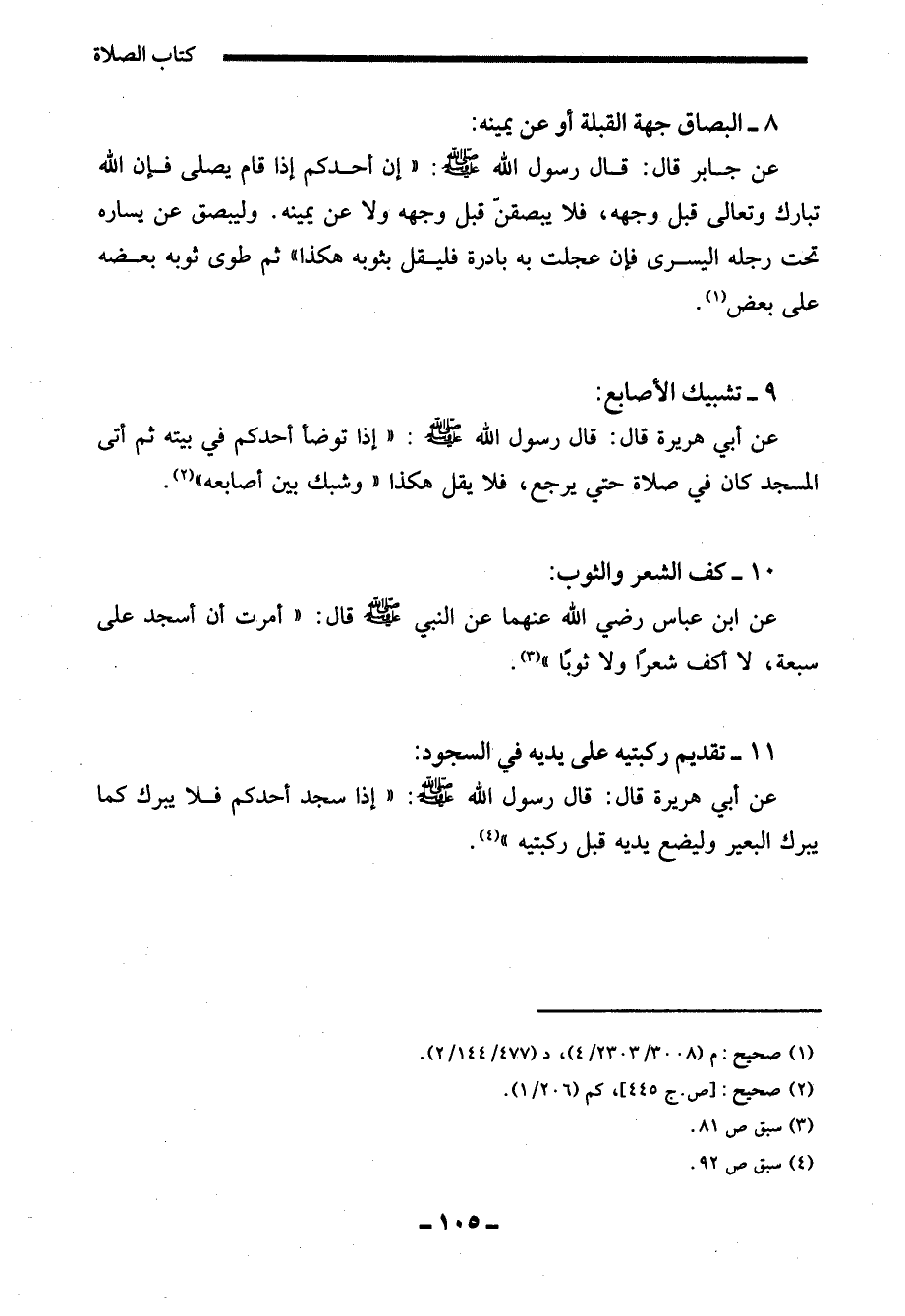 عن ابن عباس رضي الله عنهما عن النبي - صلى الله عليه وسلم - قال: "أمرت أن أسجد على سبعة، لا أكف شعرًا ولا ثوبًا" (¬3).
