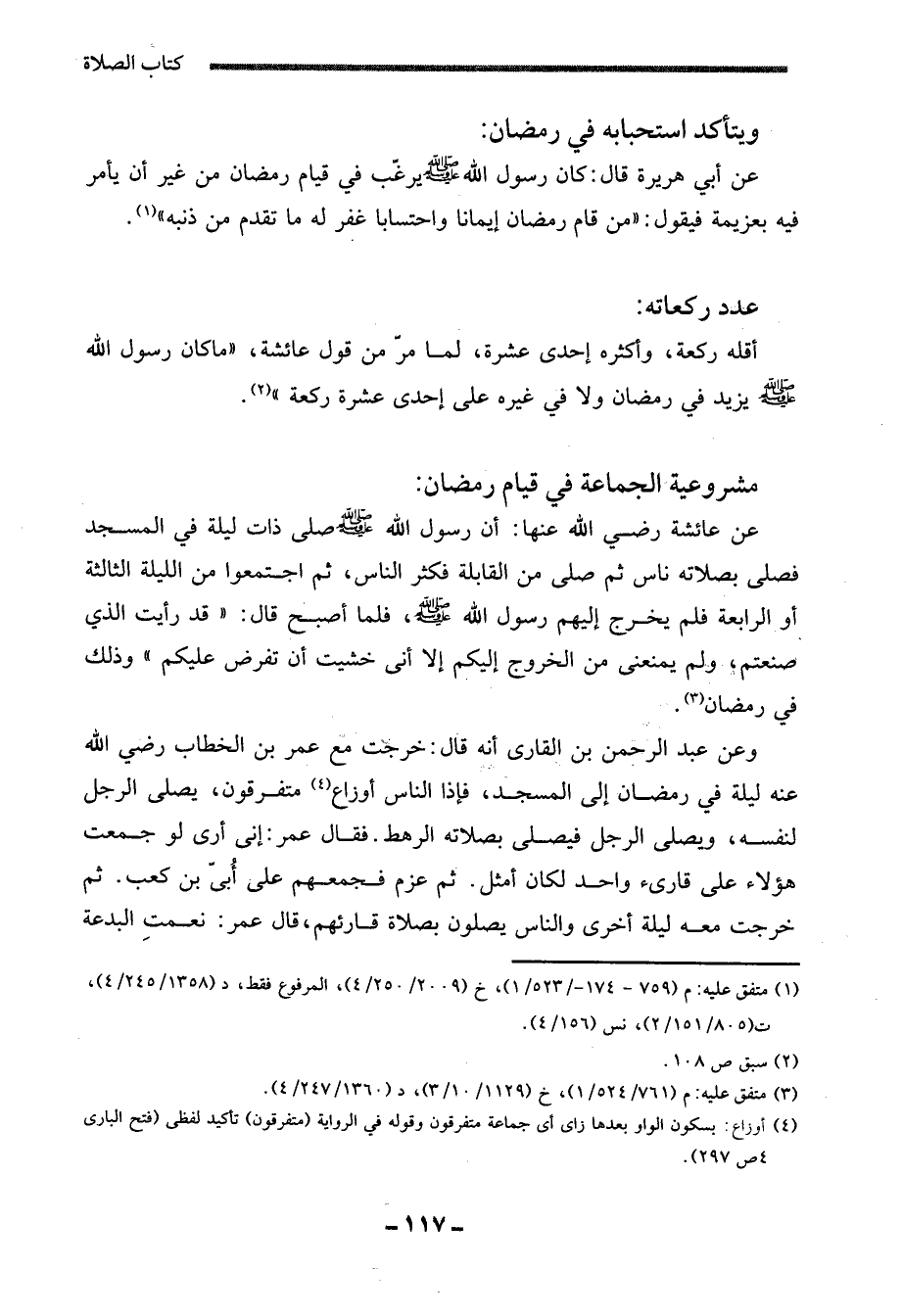عن عائشة رضي الله عنها: أن رسول الله - صلى الله عليه وسلم - صلى ذات ليلة في المسجد فصلى بصلاته ناس ثم صلى من القابلة فأكثر الناس، ثم اجتمعوا من الليلة الثالثة أو الرابعة فلم يخرج إليهم رسول الله - صلى الله عليه وسلم -، فلما أصبح قال: "قد رأيت الذي صنعتم، ولم يمنعنى من الخروج إليكم إلا أنى خشيت أن تفرض عليكم" وذلك في رمضان (¬3).