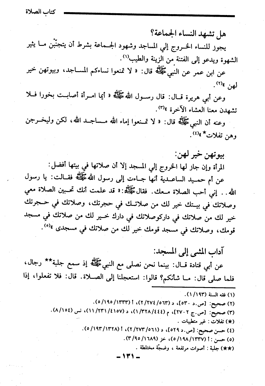 عن أم حميد الساعدية أنها جاءت إلى رسول الله - صلى الله عليه وسلم - فقالت: يا رسول الله .. إني أحب الصلاة معك. فقال - صلى الله عليه وسلم -: "قد علمت أنك تحبين الصلاة معي وصلاتك في بيتك خير لك من صلاتك في حجرتك، وصلاتك في حجرتك خير لك من صلاتك في دارك وصلاتك في دارك خير لك من صلاتك في مسجد قومك، وصلاتك في مسجد قومك خير لك من صلاتك في مسجدى" (¬5).