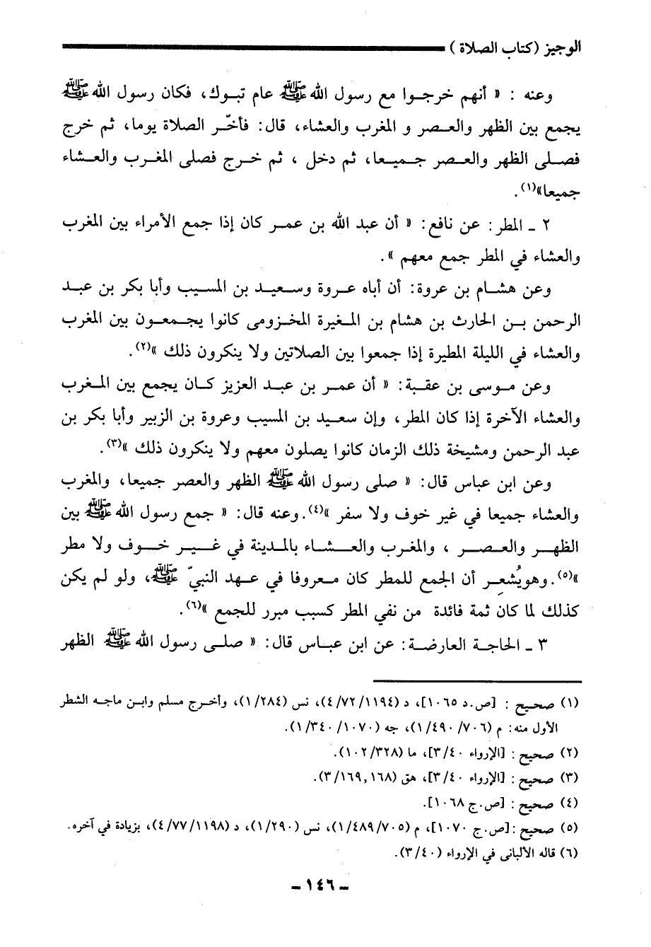 وعن ابن عباس قال: "صلى رسول الله - صلى الله عليه وسلم - الظهر والعصر جميعًا، والمغرب والعشاء جميعًا في غير خوف ولا سفر" (¬4). وعنه قال: "جمع رسول الله - صلى الله عليه وسلم - بين الظهر والعصر، والمغرب والعشاء بالمدينة في غير خوف ولا مطر" (¬5). وهويُشعِر أن الجمع للمطر كان معروفا في عهد النبيّ - صلى الله عليه وسلم -، ولو لم يكن كذلك لما كان ثمة فائدة من نفي المطر كسبب مبرر للجمع" (¬6).