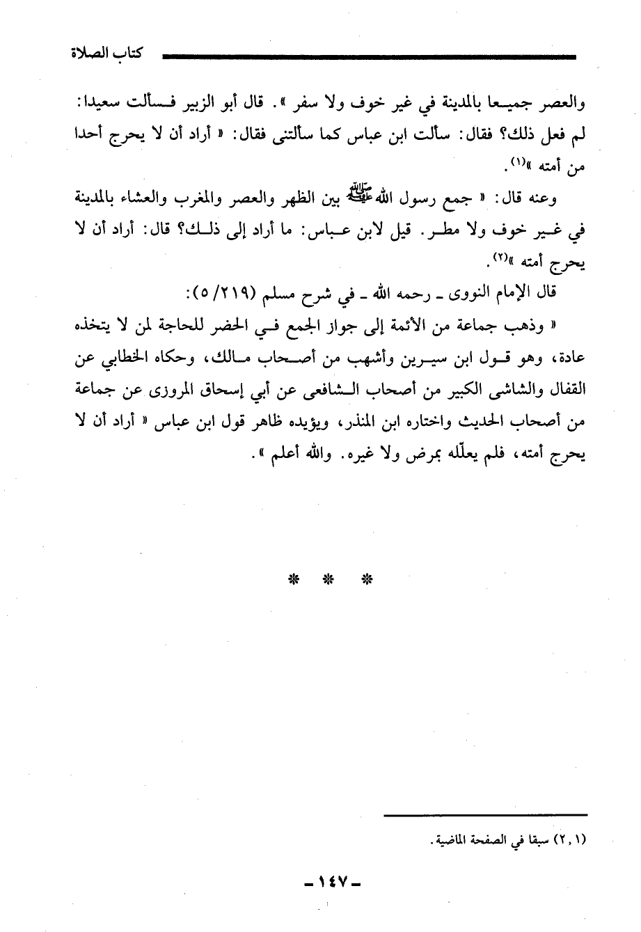 "وذهب جماعة من الأئمة إلى جواز الجمع في الحضر للحاجة لمن لا يتخذه عادة، وهو قول ابن سيرين وأشهب من أصحاب مالك، وحكاه الخطابي عن القفال والشاشى الكبير من أصحاب الشافعي عن أبي إسحاق المروزى عن جماعة من أصحاب الحديث واختاره ابن المنذر، ويؤيده ظاهر قول ابن عباس "أراد أن لا يحرج أمته، فلم يعلّله بمرض ولا غيره. والله أعلم".