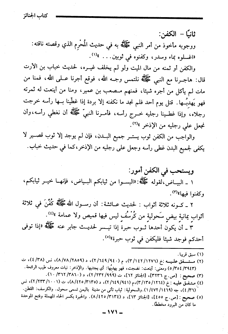 (¬4) متفق عليه: خ (1264/ 135/ 3)، م (941/ 649/ 2)، د (3135/ 425/8)، ت (1001/ 233/ 2)، نس (36/ 4)، جه (1469/ 472/ 1). والسحولية: ثياب تأتي من مدينة باليمن تسمى سحول. والكرسف: القطن.
